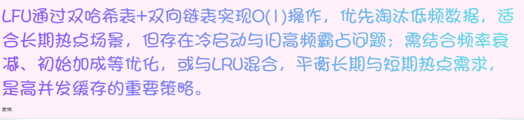 缓存容量达到上限时,系统会选择当前所有数据中访问频率最低的条目进行淘汰;若多个数据的频率相同,则进一步淘汰其中最久未被访问 的(类似LRU的兜底逻辑)。