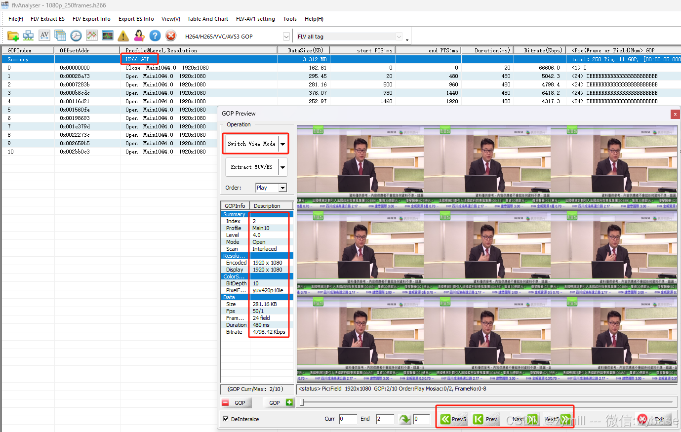 - FLV 结构可视化:Tag 列表、时间戳、音视频帧类型、Metadata 解析、GOP 预览。