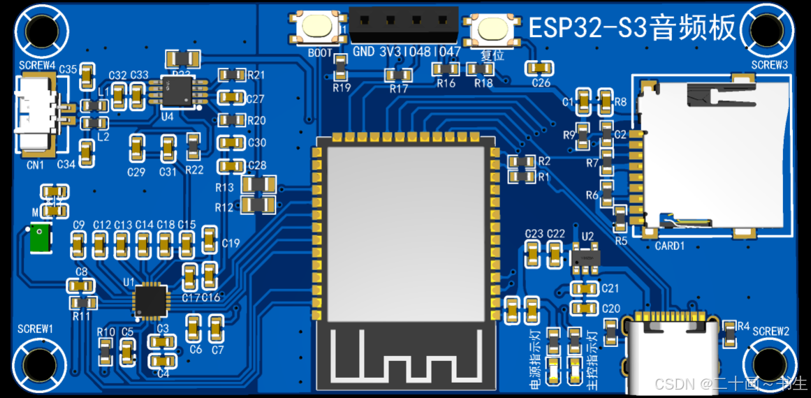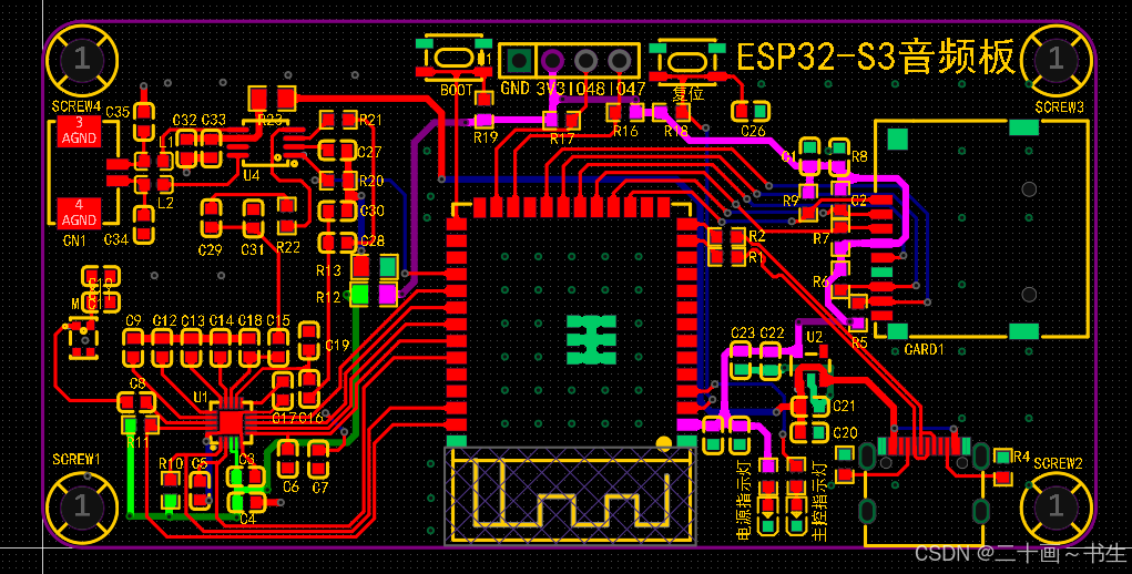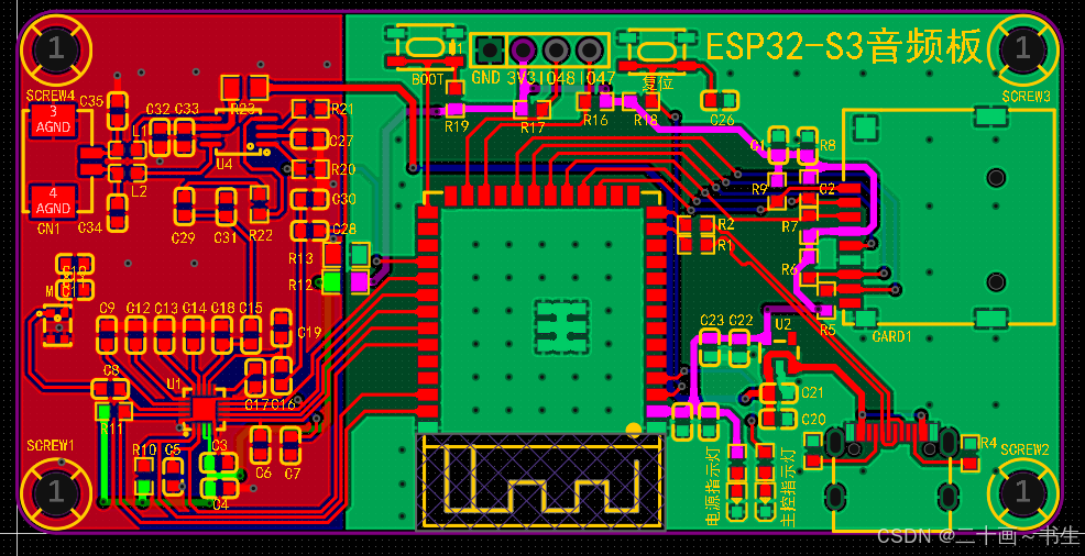 ESP32-S3音频板2层PCB依据功能优先级与信号特性,划分为8大核心模块,各模块的布局、布线均结合ESP32-S3芯片的引脚分布、音频信号的特殊性及2层板的布线限制,进行针对性设计,兼顾模块协同性与信号稳定性,同时适配嘉立创EDA与AD两款工具的设计规范,各模块详细设计如下: