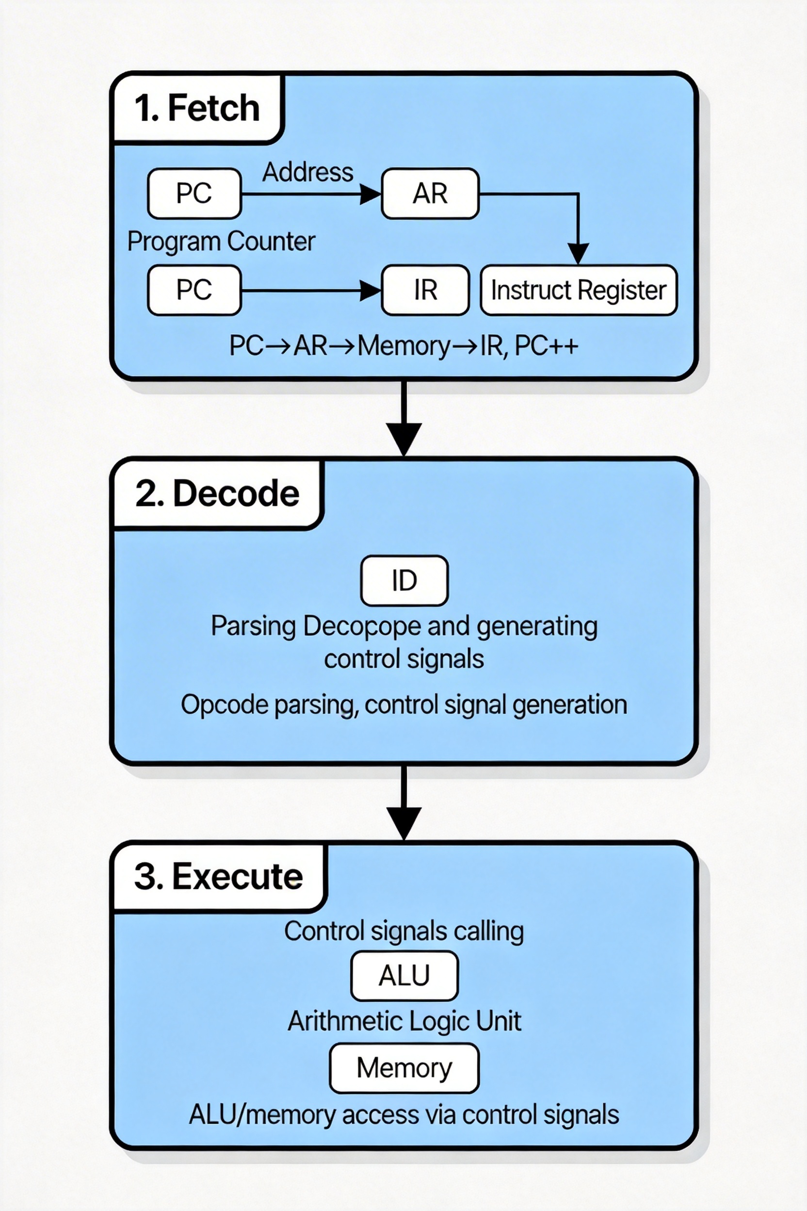 控制器的核心工作流程为三级流水线循环:取指阶段(PC 输出地址到 AR,从内存读取指令存入 IR,PC 自动递增)→ 译码阶段(ID 解析 IR 中的操作码,生成控制信号)→ 执行阶段(根据控制信号调用运算器、存储器等模块完成对应操作)。