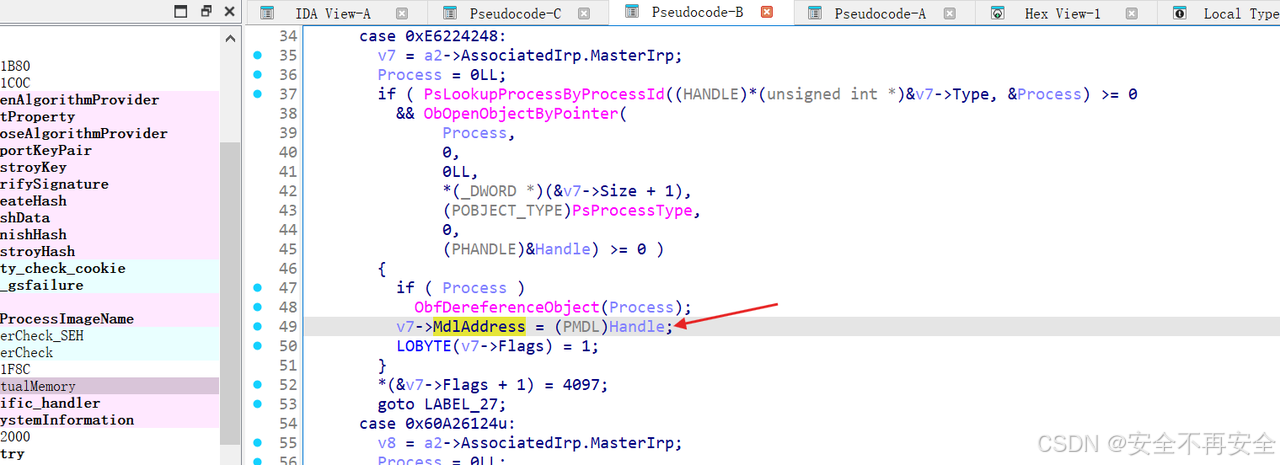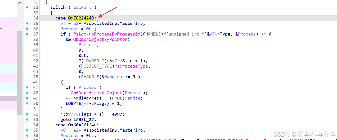 如下图所示,0xE6224248 分支的作用是:接收一个进程 ID(用户态传递) -> 通过 PsLookupProcessByProcessId 找到进程对象 -> 通过 ObOpenObjectByPointer 打开进程句柄 -> 将句柄存入 IRP 的 MdlAddress 字段返回。