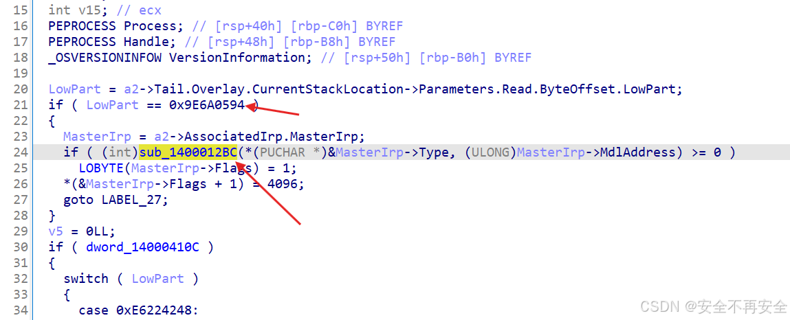 要进入 sub_1400012BC 函数需要满足 IOCTL 控制码为 0x9E6A0594