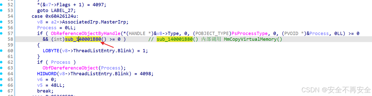 在 sub_140001B80 函数中可以获取到 IOCTL 控制码,如下图所示可知要进入 sub_140001B80 需要满足 IOCTL 控制码为 0x60A26124。sub_140001B80 也就是任意读漏洞函数。