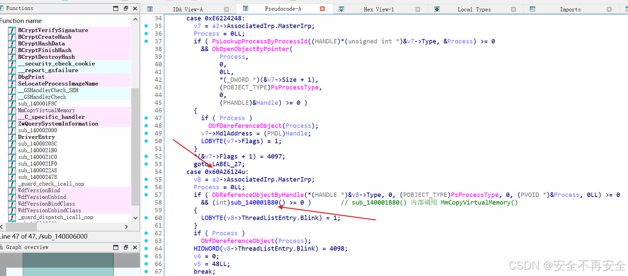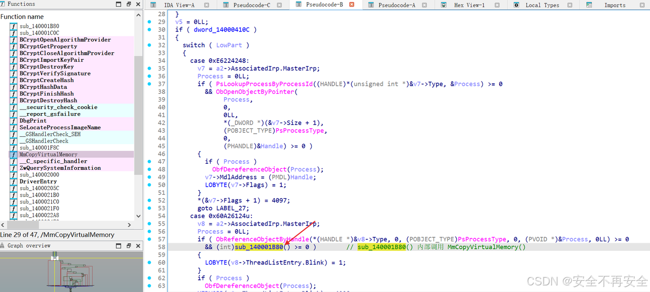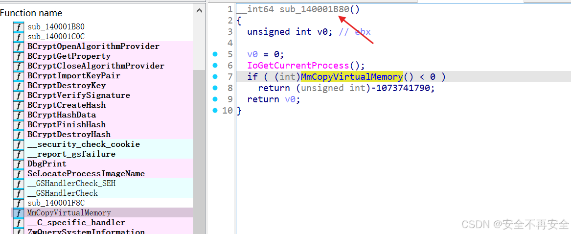 接着交叉引用看谁调用了 MmCopyVirtualMemory 这个函数,如下图所示 sub_140001B80 调用了 MmCopyVirtualMemory 函数