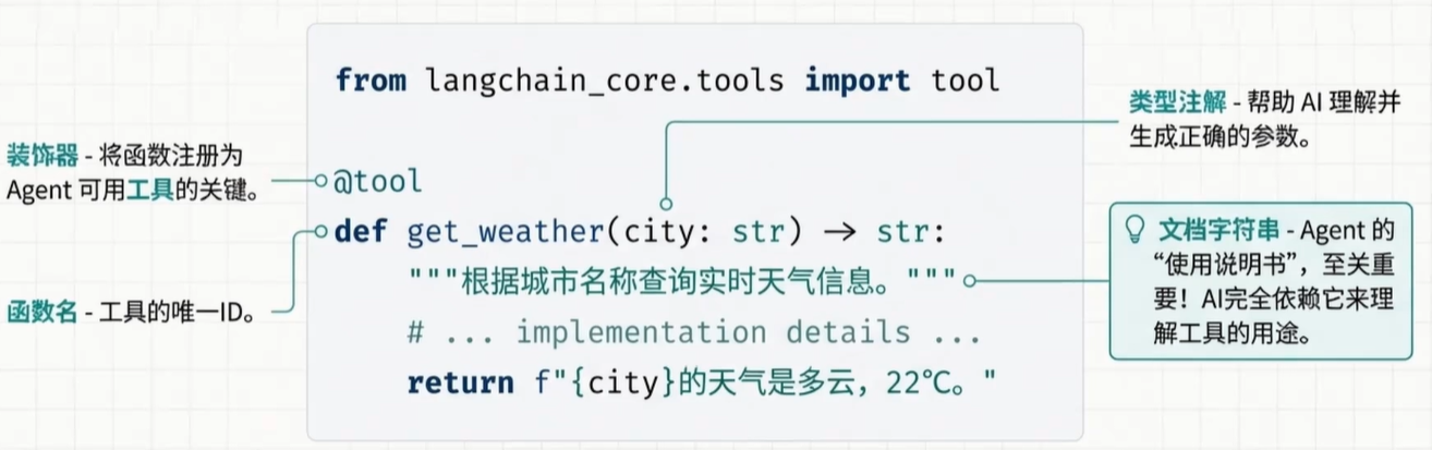 是什么:通过tool工具机制可以使得模型具有'调用外部函数'的能力,是的其可以与外部系统、API或者自定义函数进行交互,从而完成仅靠文本生成无法完成的任务(LLM本身不执行函数,只是知道调用哪个函数和如何调用),简单来说就是LLM的外部工具类
