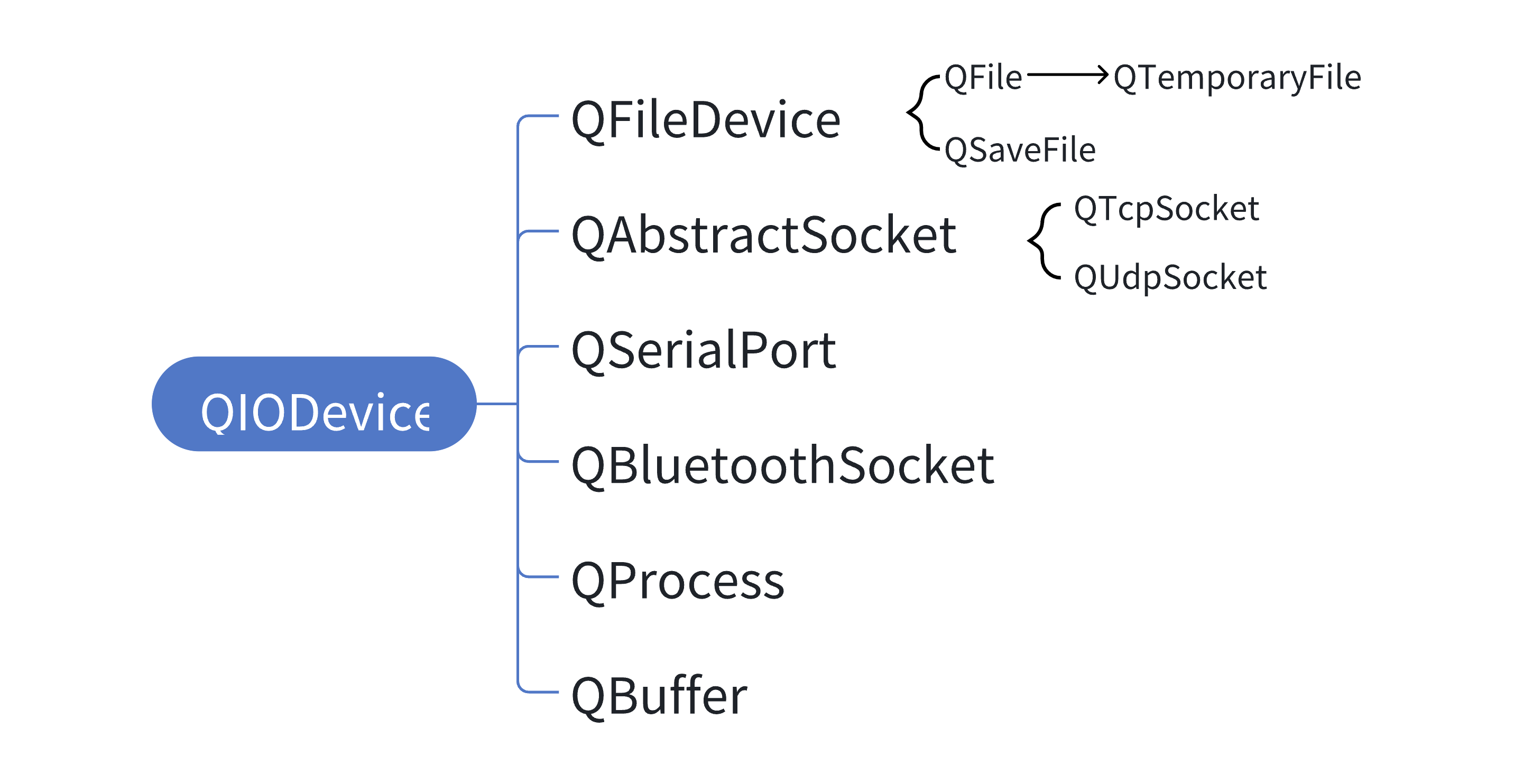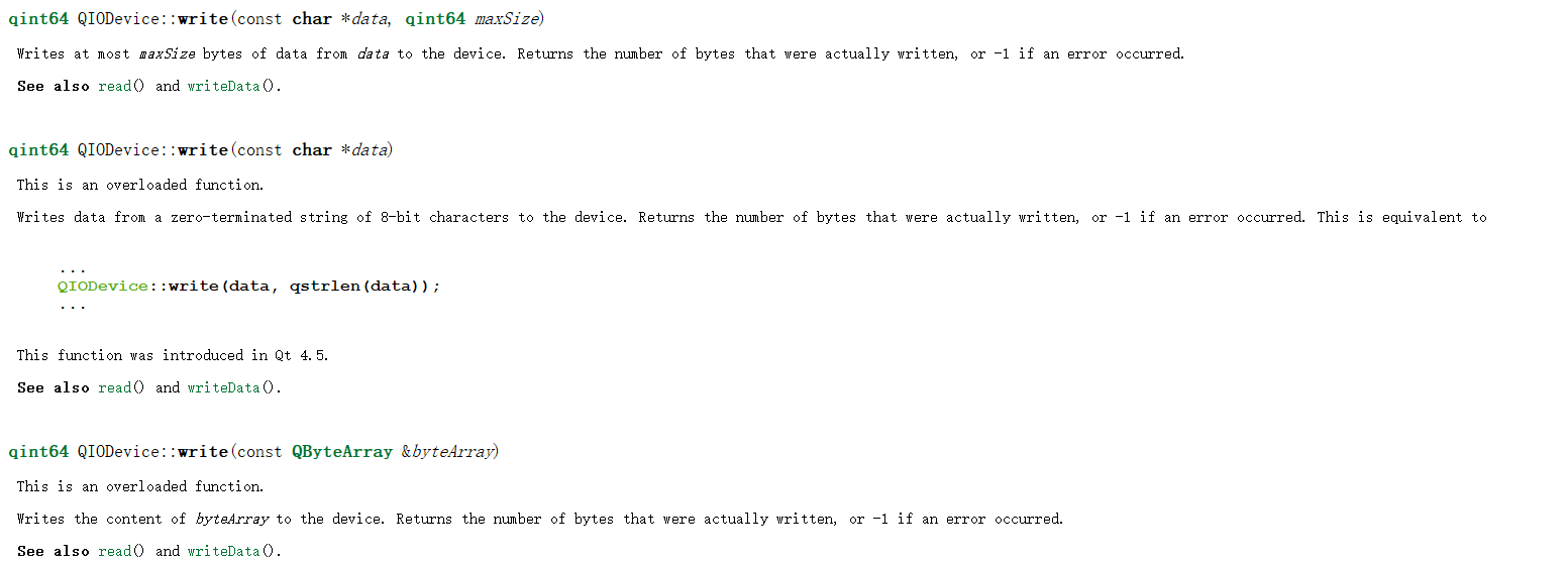 大部分的类都是继承于QIODevice,其余的子类都是各自封装了不同的操作,像QFile的子类QTemporaryFile,是用来处理临时文件的,当这个对象销毁时,对应的文件就自动删除了。QSaveFile是用于要写入大量的数据时用到的,写文件的时候,往往会把旧的文件先清空再写入。万一新的数据写一半,结果出错了,新的数据用不了了,旧的数据也无了。因此如果你想要写入一个文件,会自动把内容写到临时文件中,这样不会破坏原有的文件,等到所有内容都写完了之后,再把旧文件自动删除,并且用新的文件代替旧的文件,这种策略是一个广泛常见的策略。QSerialPort是串口相关的,串口一种比较古老的通信方式,一般是在嵌入式系统上,一般性通过串口和开发板之间进行交互。QProcess是相对于是对fork/exec操作进行的封装。