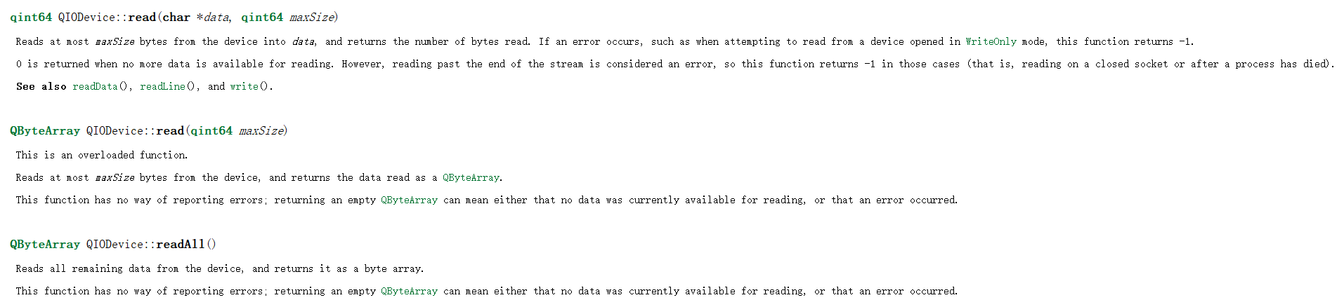 读的函数也有好几个,但是都大差不差,read函数既可以使用返回值来获取读的内容也可以通过字符数组,也可以使用readAll来读取所有的内容,以及readLine来按行读取。其中QByteArray可以把它当成QString,他们是可以互相转换的。