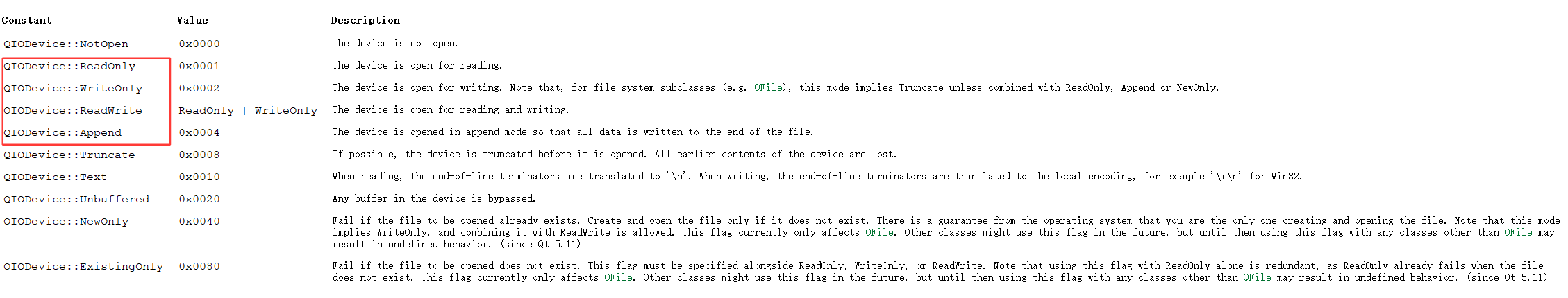 QIODevice::OpenMode是用来设置打开方式,只要构造函数,指定了路径之后,可以直接通过这个版本的open打开即可。