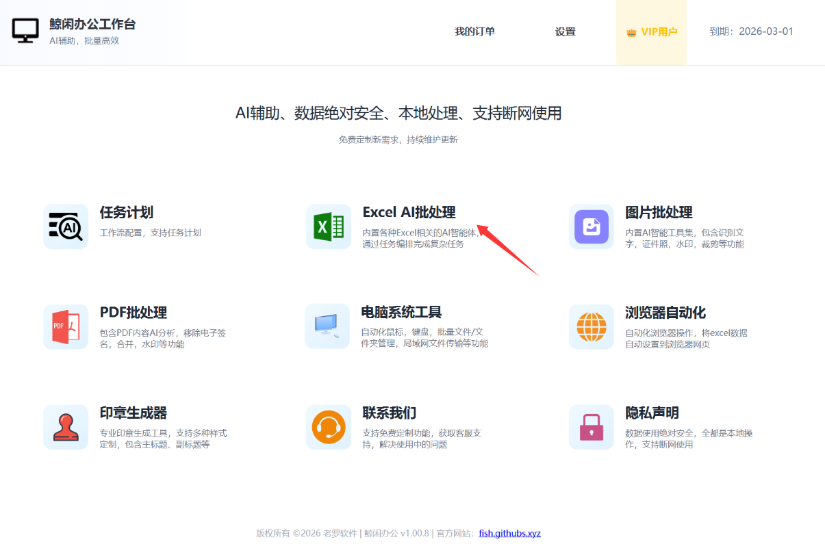 这是一个专业AI批处理的解决方案, 支持本地断网使用模型。数据绝对安全,可断网使用。 首先在主界面上找到 Excel AI批处理: