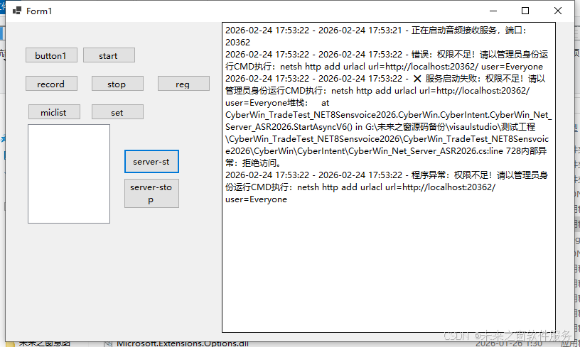 GlobalLogManagerV12.WriteGlobalLog("错误:Windows需要管理员权限!请执行命令授权端口:netsh http add urlacl url=http://*:" + _port + "/ user=Everyone");