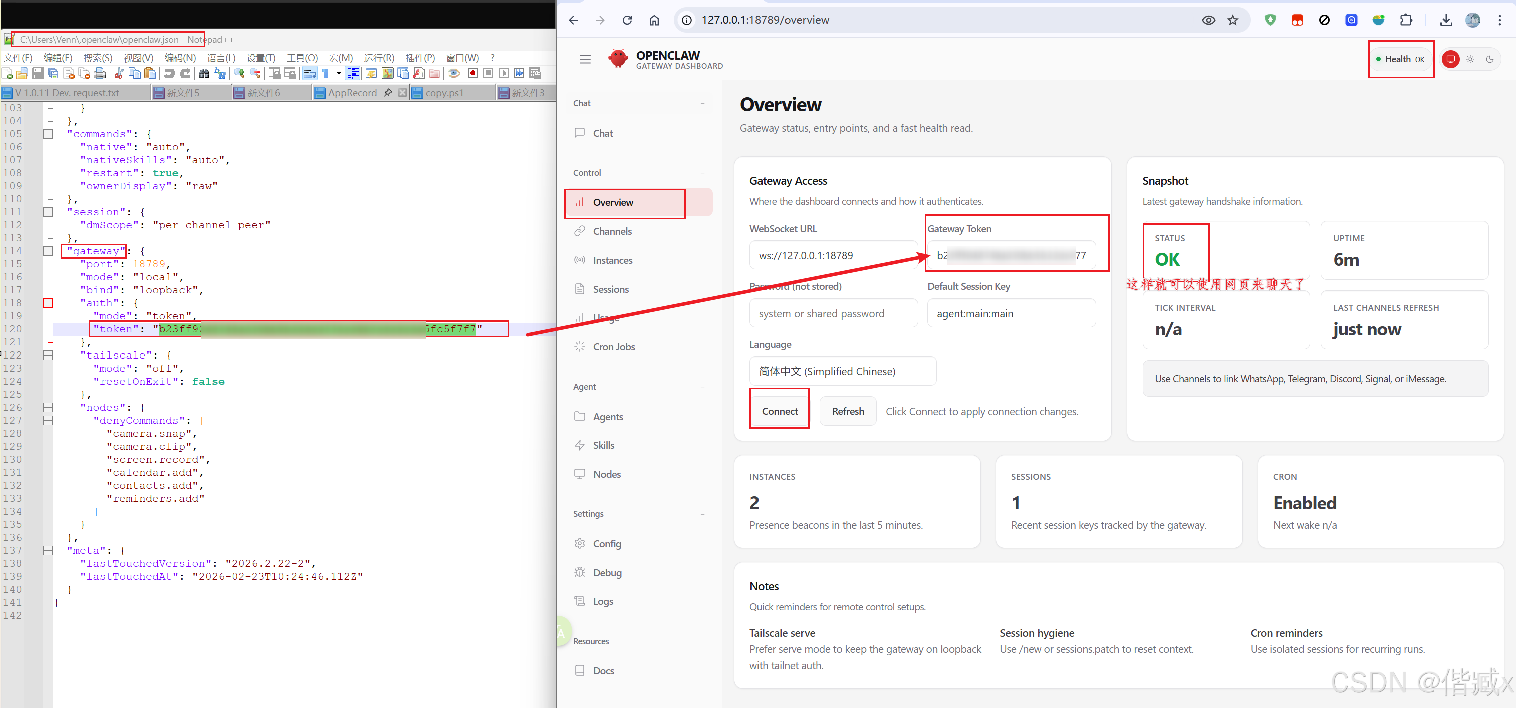 打开 "C:\Users\Venn\.openclaw\openclaw.json" 文件,选中 gateway - token 拷贝到网页里面。这样就能够在网页里面直接聊天。右上角也会显示 online 绿色图标