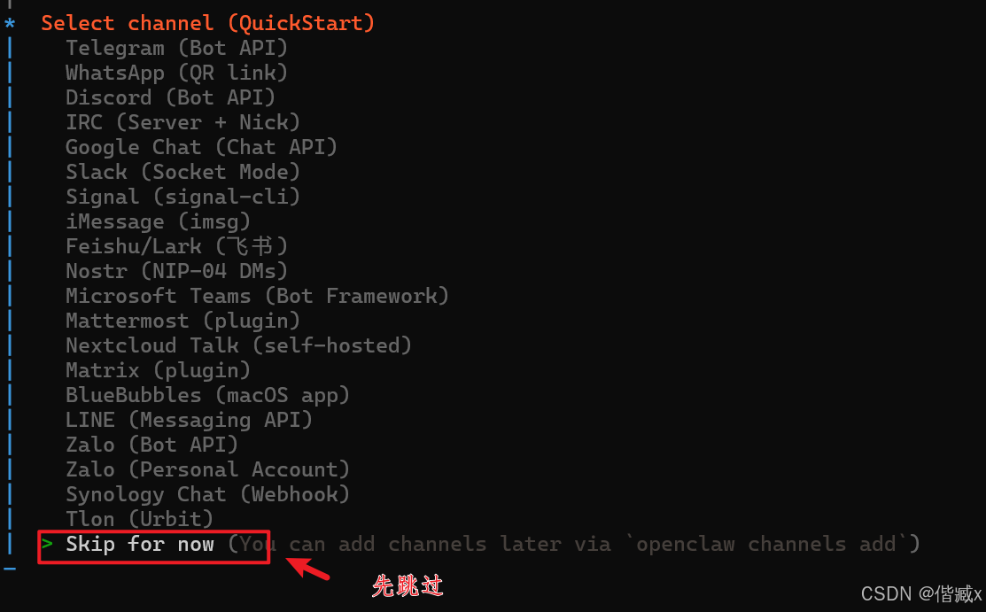 向导会让你选择 AI 模型、是否连接即时通讯平台等选项。若只想先跑通本地流程,可以选择跳过连接即时通讯平台,后续再单独安装飞书插件。