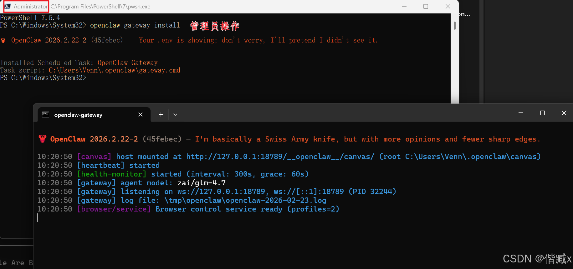 openclaw gateway install // 必须 管理员 权限,用的 pwsh7