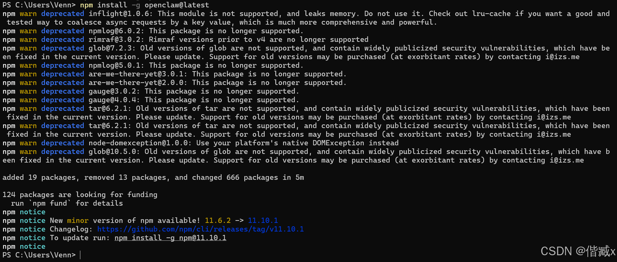 npm install -g openclaw@latest // 安装, 耗时略久,稍等片刻