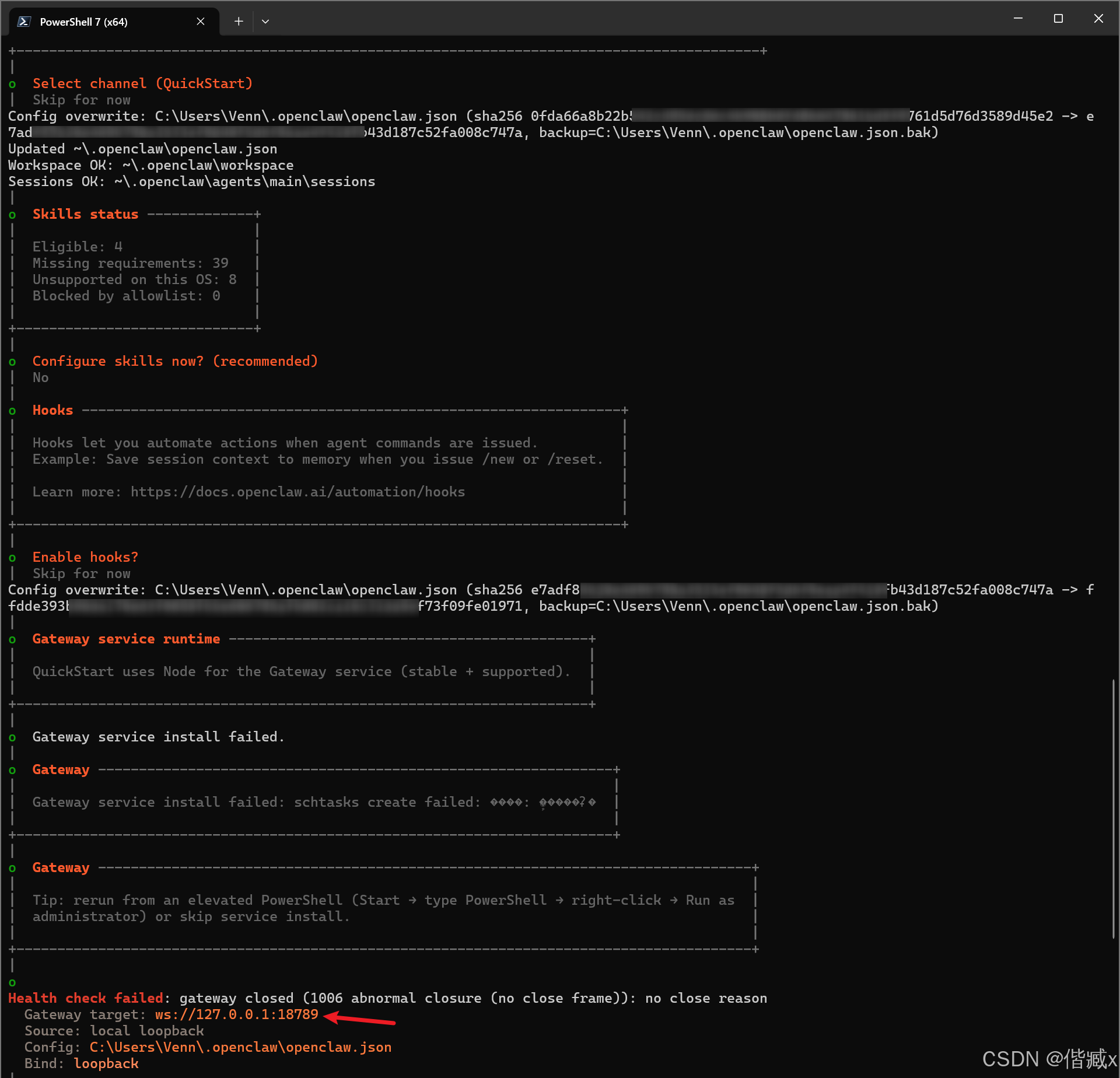 openclaw gateway已安装并以管理员权限启动;检查本地防火墙或端口占用。 - 插件安装报 spawn EINVAL :采用"先安装再拷贝"的方法,或在扩展目录中手动