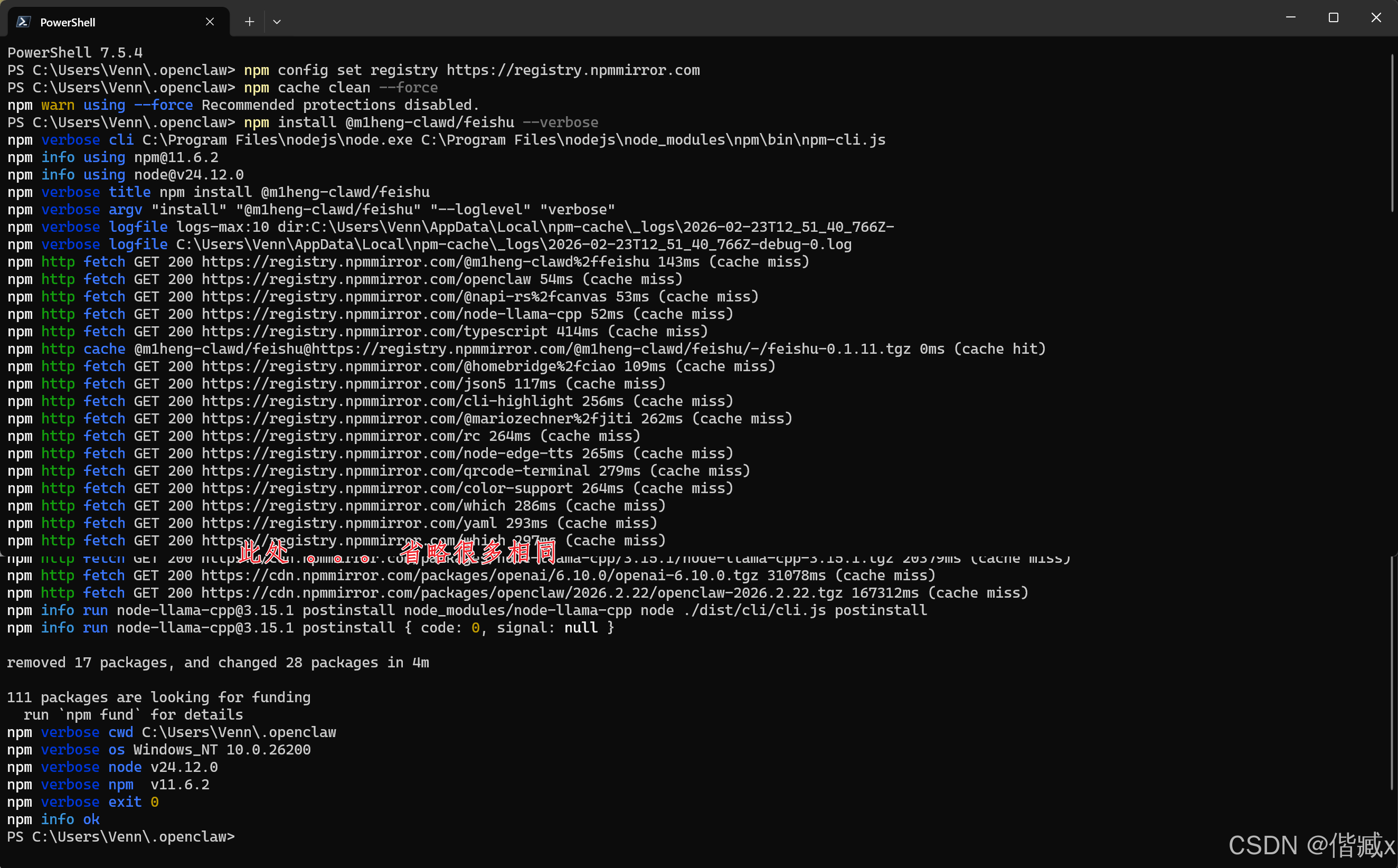 PS C:\Users\Venn\.openclaw\extensions\feishu> npm install --prod // 很重要一步,不换源也很慢或者失败
