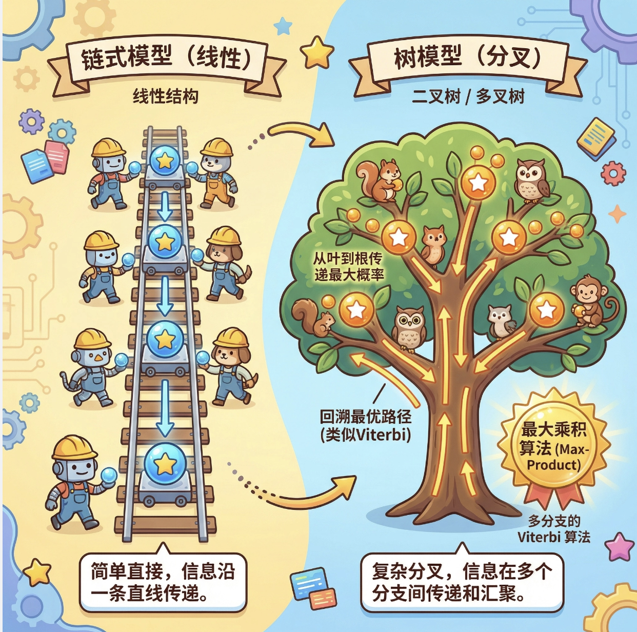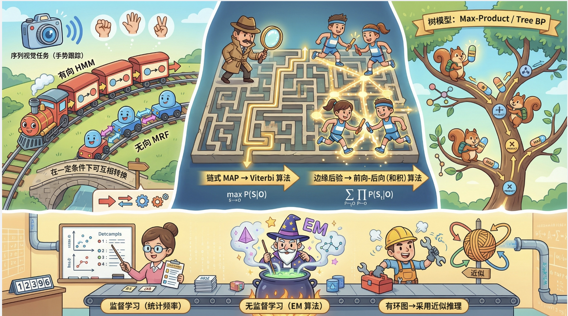 2.链式 MAP 推理用 Viterbi 算法,边缘后验推理用前向后向(和积)算法;树模型是链式模型的扩展,推理用 Max-Product/Tree BP 算法;