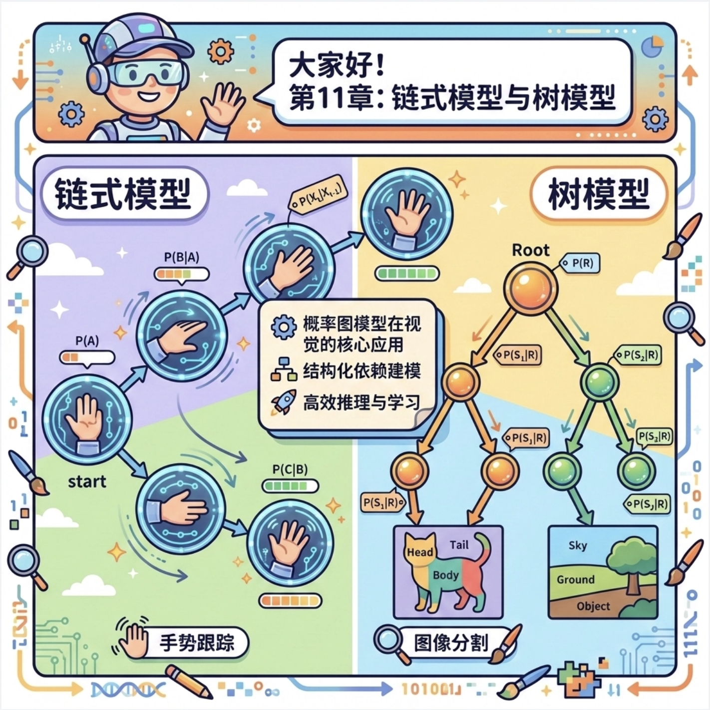 大家好!今天我们来深入拆解《计算机视觉:模型、学习和推理》这本书的第 11 章 ------ 链式模型和树模型。这一章是概率图模型在计算机视觉中的核心应用,很多经典的视觉任务(比如手势跟踪、图像分割)都离不开这些模型。
