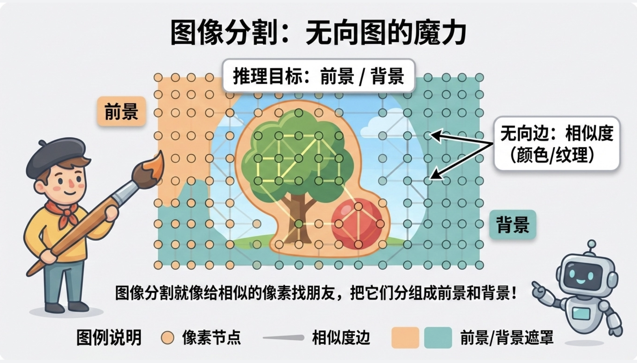 - 边:相邻像素的相似度(颜色 / 纹理);