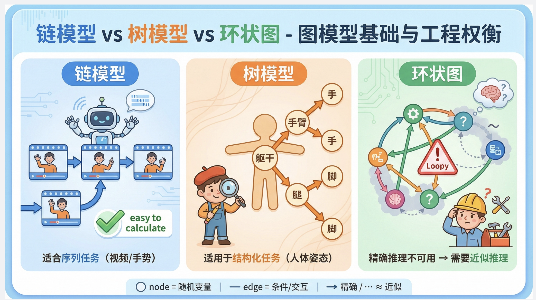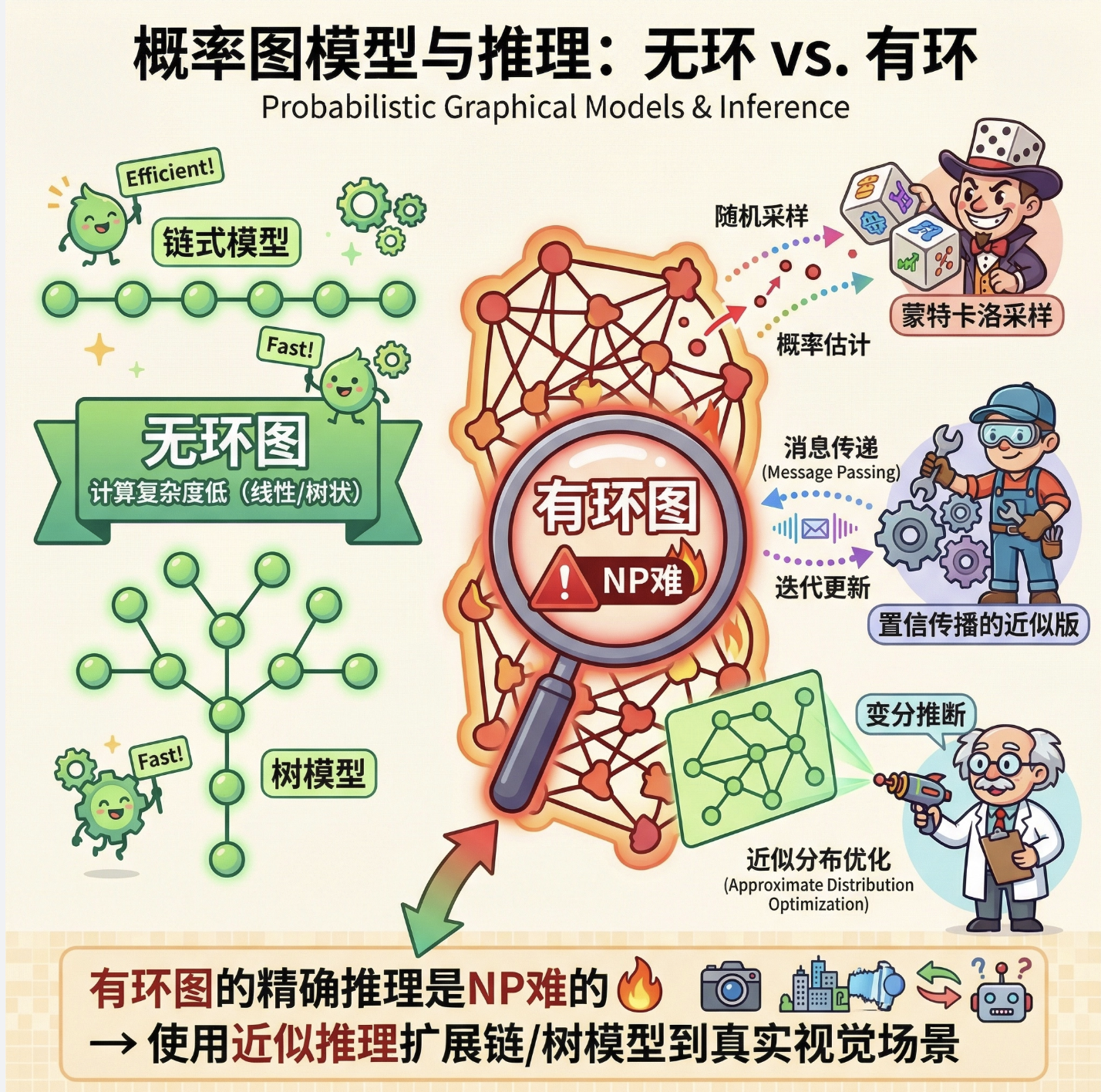 3.精确推理只适用于无环图,有环图需要用近似推理,这是工程应用中的核心挑战。