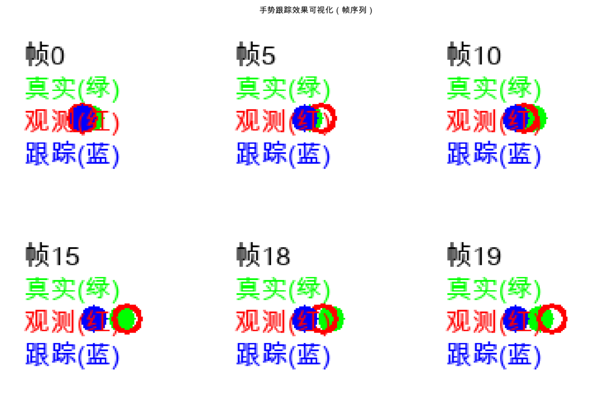 - 绘制模拟图像中的手势位置,用不同颜色区分真实 / 观测 / 跟踪位置,贴合视觉任务场景。