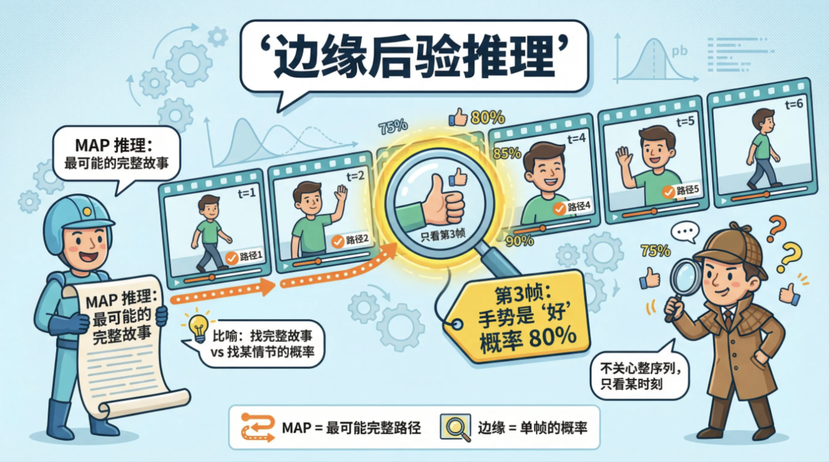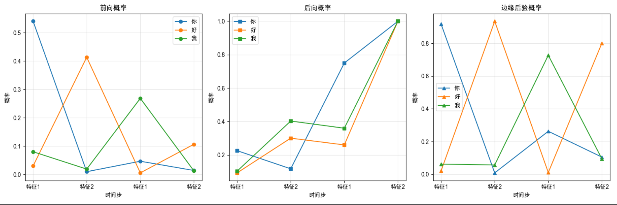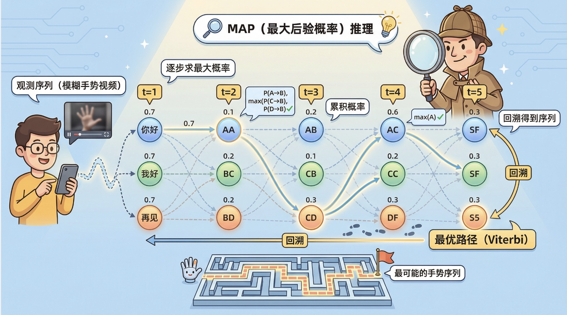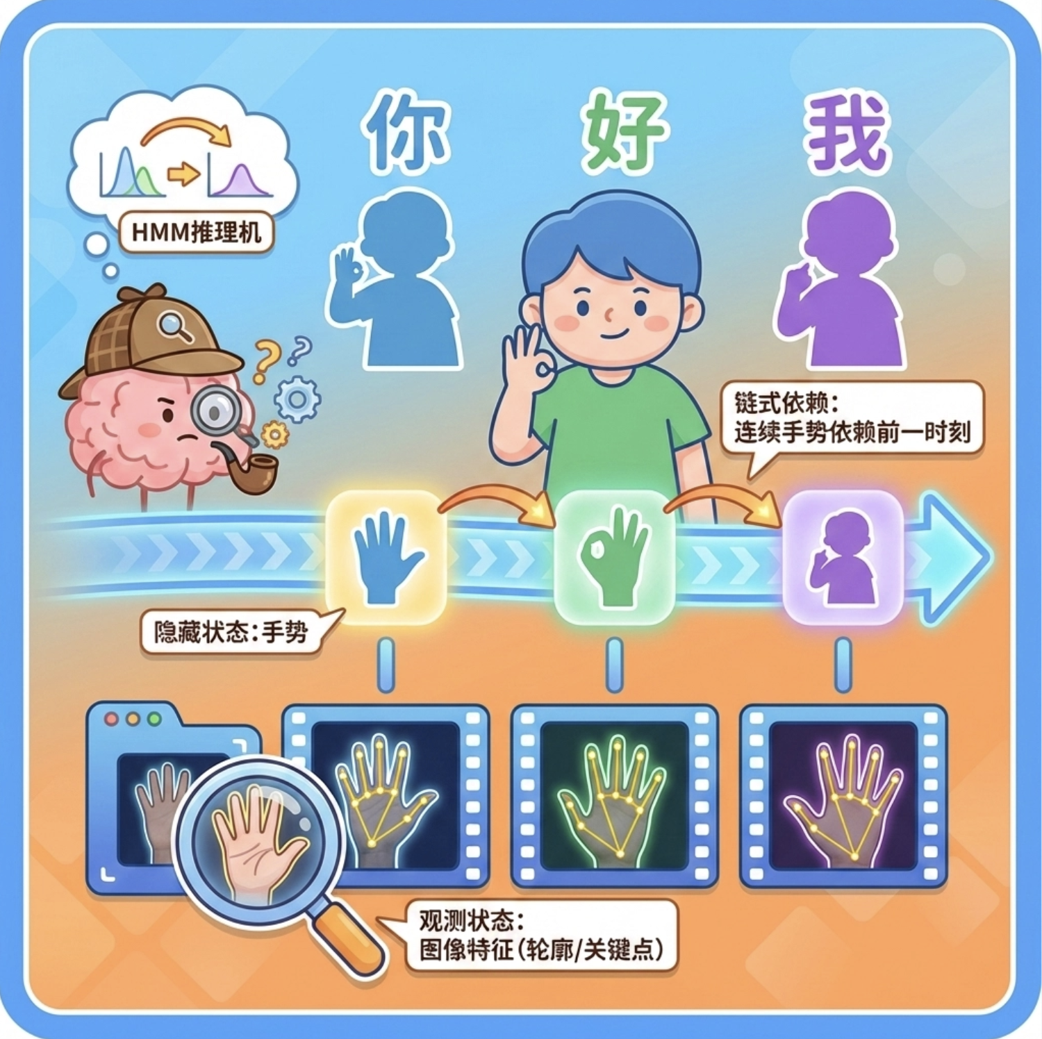 - 隐藏状态:每个时刻的手势(比如 "你""好""我");