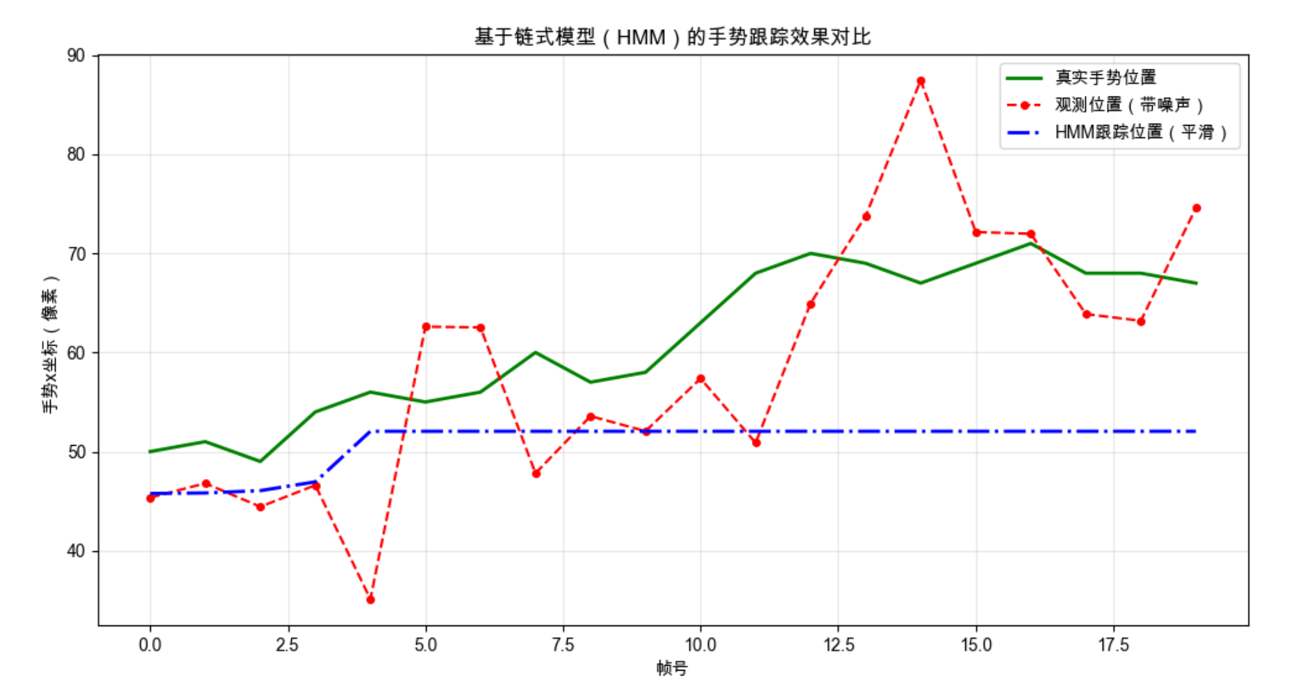 - 模拟手势的真实运动轨迹、带噪声的观测轨迹、HMM 跟踪后的平滑轨迹;