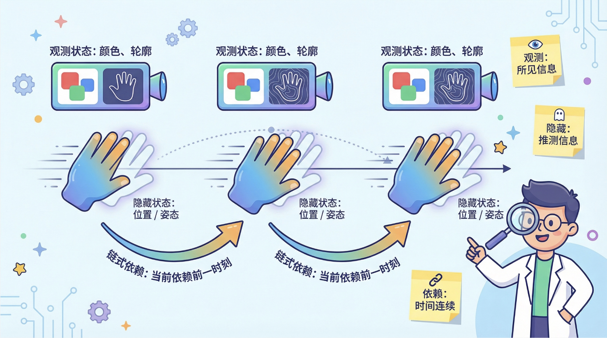 - 观测状态:手势的图像 / 视频特征(比如轮廓、关键点);