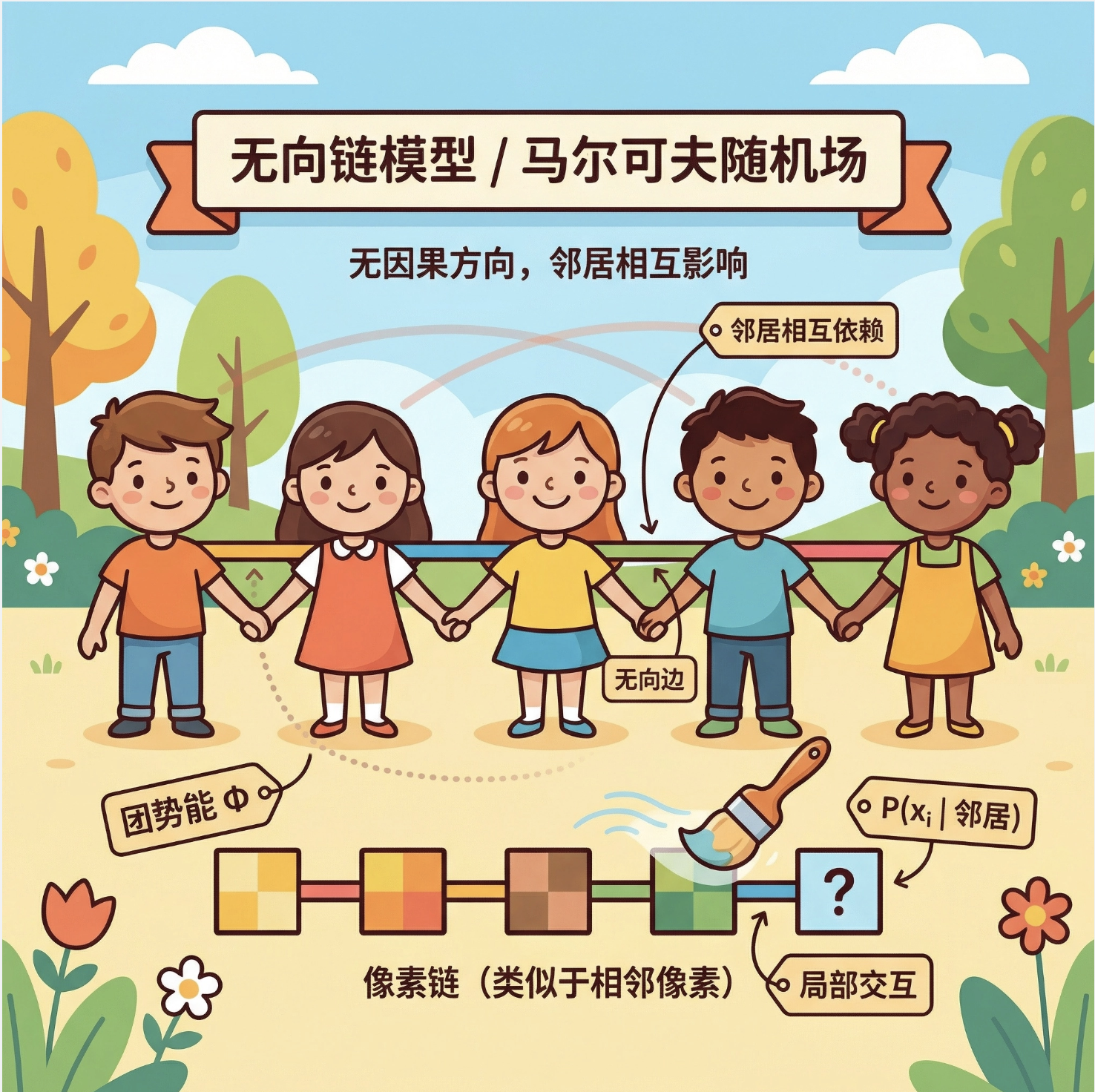 无向链式模型(也叫马尔可夫链随机场)没有 "因果" 的方向,节点之间是相互依赖的 ------ 就像手拉手的小朋友,相邻的两个小朋友会互相影响,但不相邻的小朋友没有直接影响。