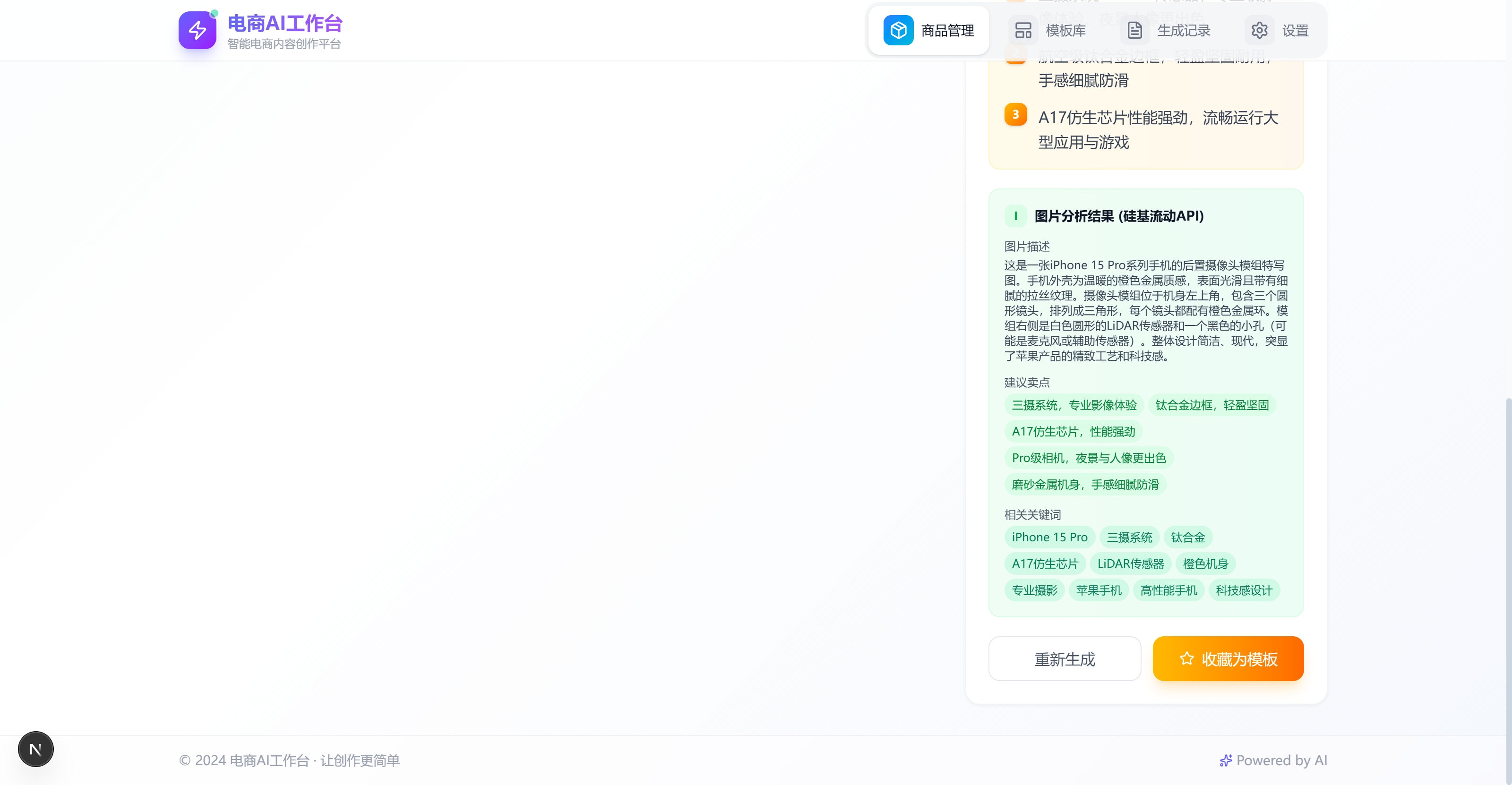 基于下面的图生文接口 API ,帮我们实现将上传的图片,自动生成电商卖点文本、关键词的功能