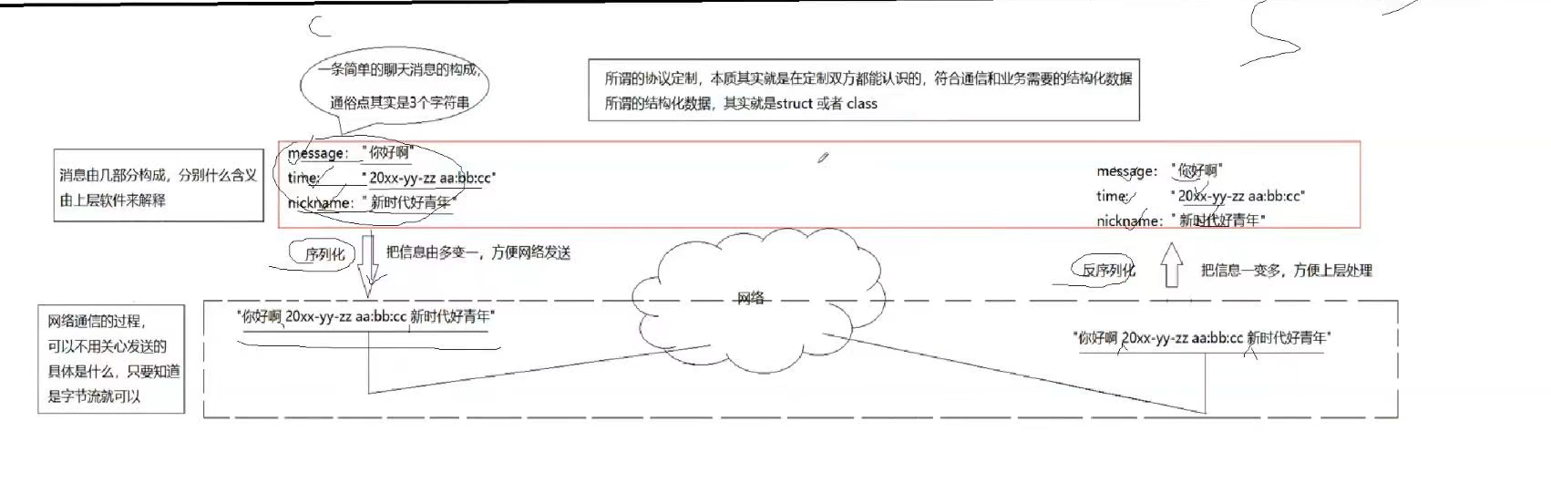 发送数据时将这个结构体按照一个规则转化成字符串,接收到数据的时候再按照相同的规则把字符串转化回结构体