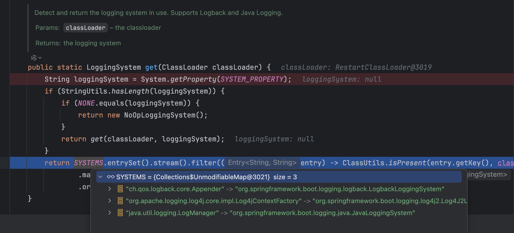 return SYSTEMS.entrySet().stream().filter((entry) -> ClassUtils.isPresent(entry.getKey(), classLoader))
