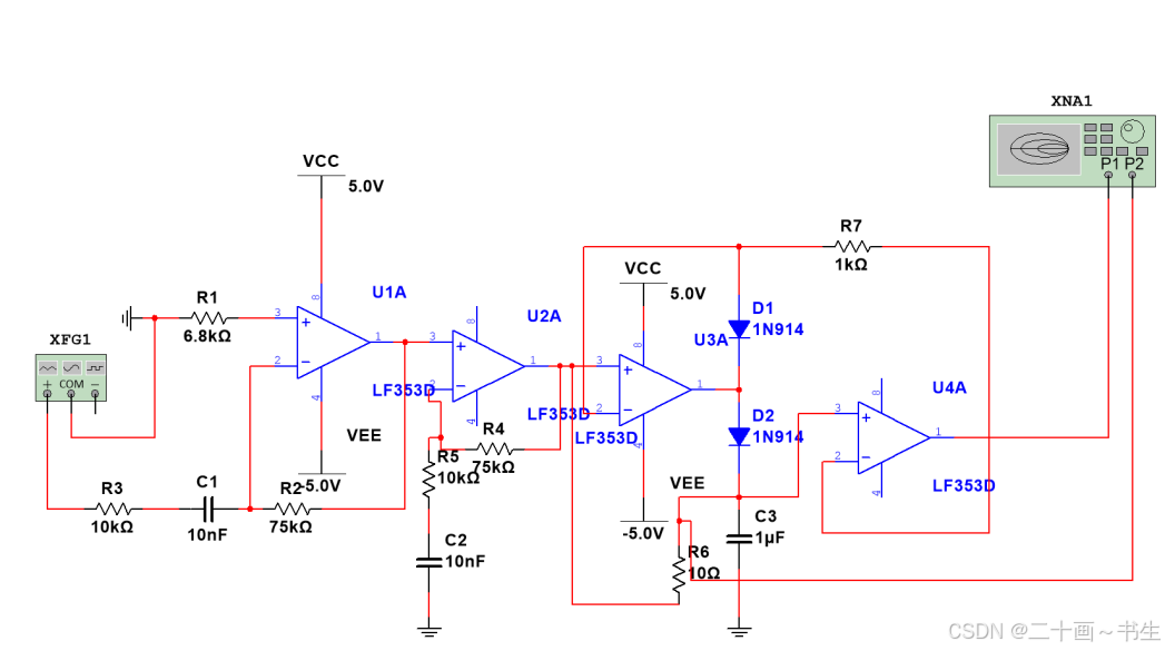 LF353双运放芯片接收40kHz超声波信号(幅度通常为mV级),进行初步放大。LF353第一级运放构成同相放大器,输入阻抗高(JFET输入级),适合接超声接收探头。增益计算:Av1 = 1 + Rf1/Rg1(建议增益20-50倍),需选用低噪声电阻。在反馈回路并联小电容(如10pF),可以高效的抑制高频噪声(设计图如图3所示)。