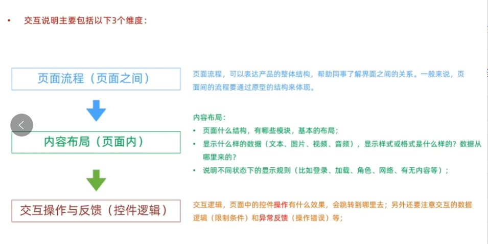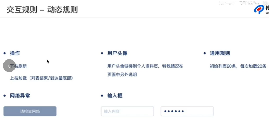 交互规则:页面中的控件操作有什么效果,会跳转到哪里去;另外还要注意交互的数据逻辑(限制条件)和异常反馈(操作错误)等