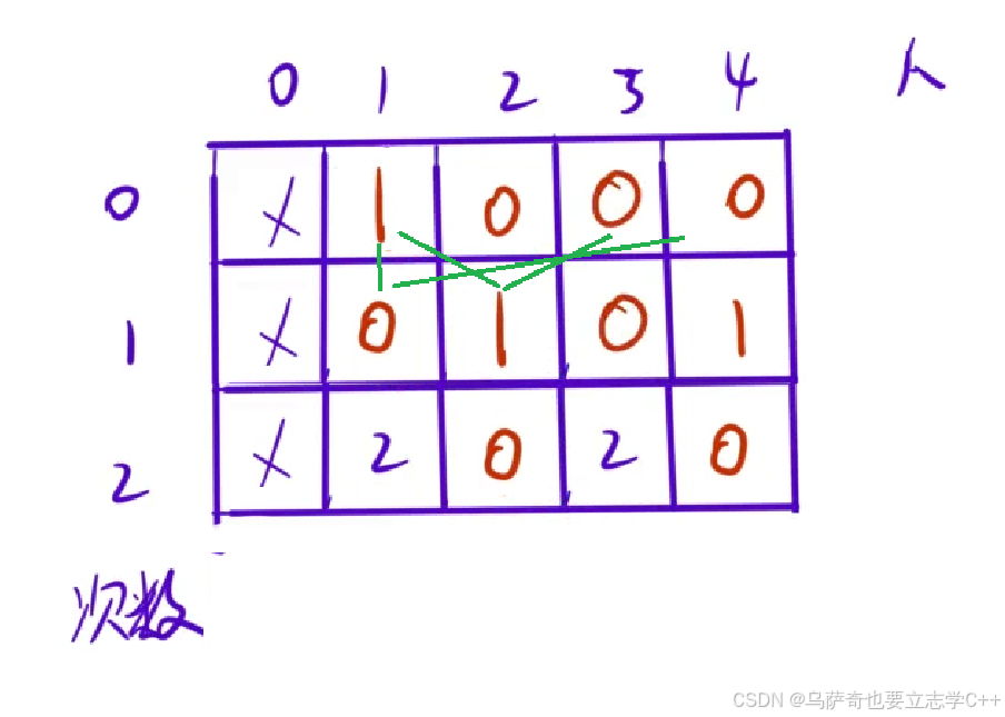 小编再补充解释一下本题的代码实现和二维数组填表顺序,总的来说是是从上往下按顺序一行一行的填,行表示传球次数,列表示同学编号,因为同学编号是从1开始的,所以第0列没有意义,第一行表示传球次数为0,此时根据题目规定球在一号同学手里,dp[0][1]就表示球传递了0次最后落在1号同学手里一共有多少种方案,所以dp[0][1]是一个合法格子,那么第一行除了一号同学其他同学的格子就没有意义了,这时我们需要思考把第一行一号同学初始化为0还是1,根据我们前面分析的状态转移方程,填格子都需要累加上一行两个格子的方案数,如果我们把dp[0][1]初试化为0,那么后面所有格子累加的结果都为0,所以我们要把dp[0][1]初始化为1,这里我们可以总结一下,对于这类求方案数的情况,因为一般情况状态转移方程都是累加的,所以一般会将初试情况初始化为1。