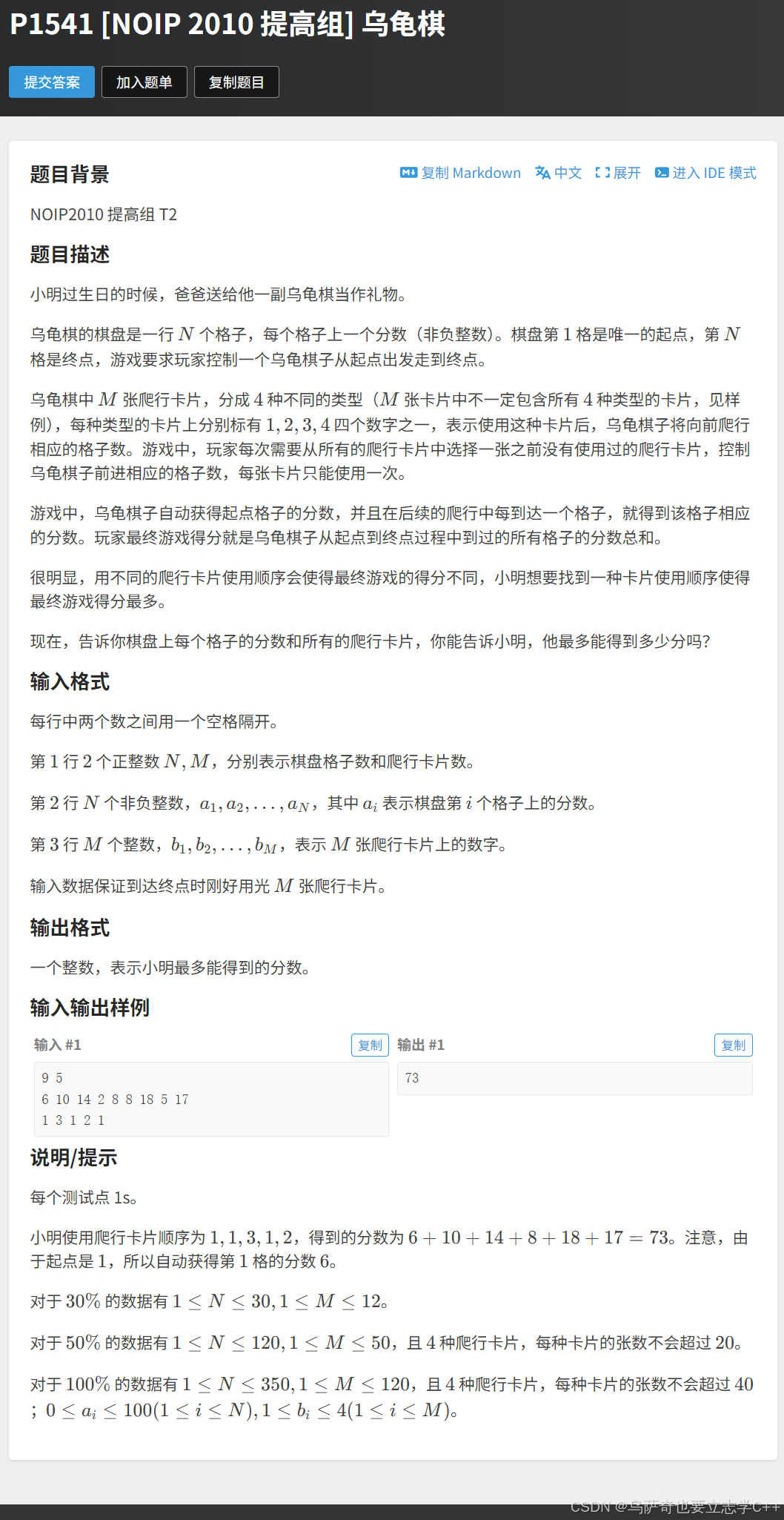 先分析一下题意,本题有点类似我们玩过的飞行棋,投骰子决定走多少步,一共有6种情况(1-6步),本题是抽卡片决定走多少步,一共有4种情况(1-4步),并且本题格子是一维的,走到某个格子即可得到该格子的分数,题目要求我们找出从起点走到终点格子的最大分数。