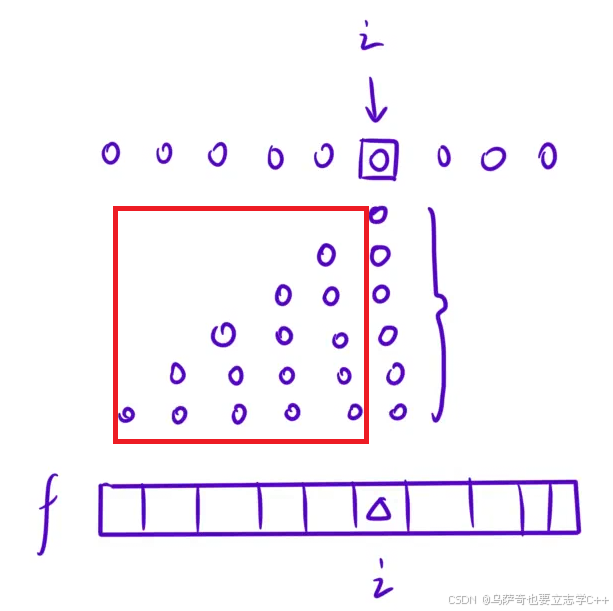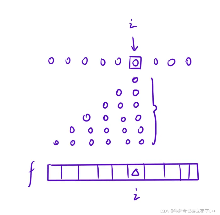 然后分析该格子应该包含哪些信息,因为题目规定所有同学站成一个圆圈,所以球可能从左边格子来也可能从右边格子来,要传递球所以必然需要知道该格子编号和左边、右边格子的编号,所以格子应该包含编号信息。然后本题还有一个条件:传球次数,也就说我还需要知道球传递了多少次后落在了谁手里,所以还应该包含传球次数信息。所以我们这里用一个一维数组是存不下两个信息的,所以我们可以用一个二维数组f[i][j]。
