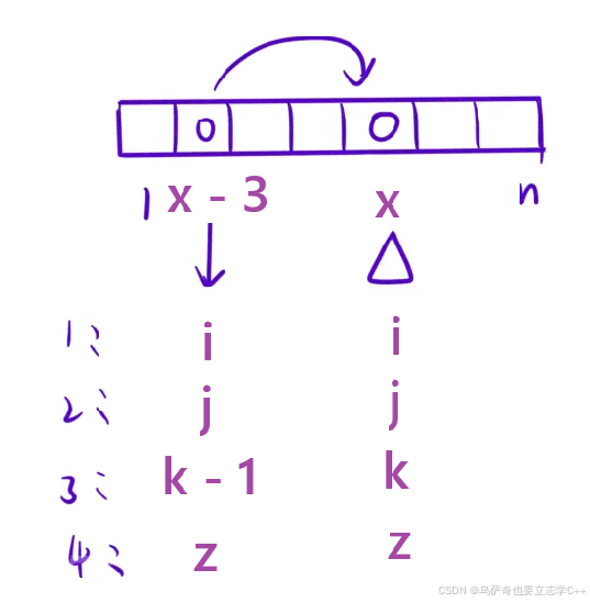 推导状态转移方程本质就是推导dp[i][j][k][z],根据我们前面的分析,dp[i][j][k][z]对应的一维数组下标是x,那么走到x一共有四种可能:分别是从x-1到x、x-2到x、x-3到x、x-4到x,对于x-1来说,它对于的dp数组是dp[i - 1][j][k][z],同理对于x-2来说,dp数组是dp[i][j - 1][k][z]... 下面示意图是以从x-3走到x为例。