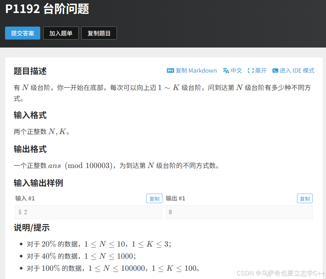 第i个台阶的方案数等于从i-1阶到i-k阶的所有方案数之和,因为本题数据比较大,用long long都无法保证数据不越界,所以题目规定方案数还需要模100003,第i个台阶的方案数等于从i-1阶到i-k阶的所有方案数之和再模上100003,所以但是注意是可能越界访问的,比如i为3,k为10,i-k是可能访问到数组负下标的,所以访问台阶时需要保证i-k始终大于等于0。
