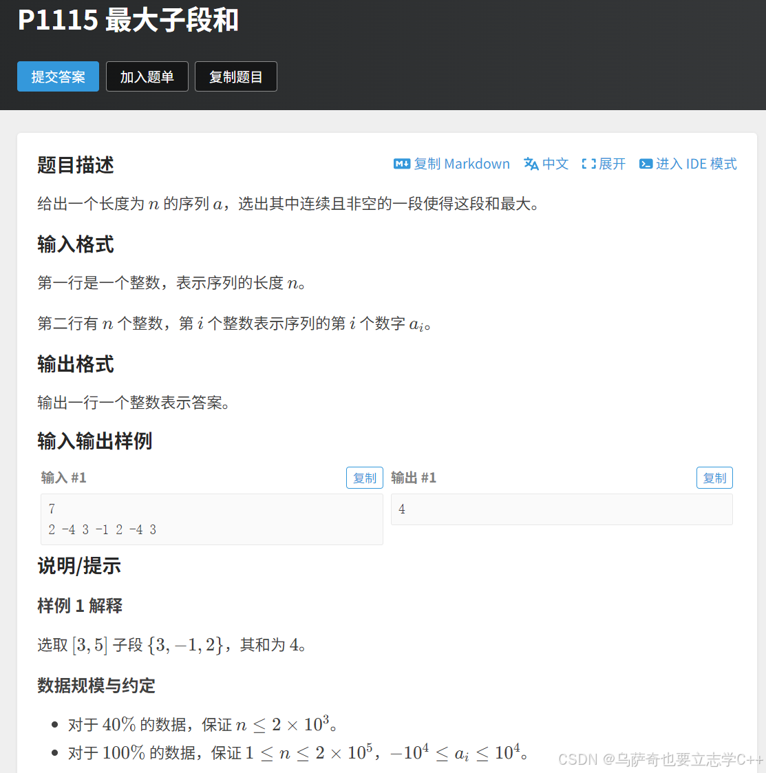那么总的来说第i个格子的最大子段和就是两种可能中取较大值: