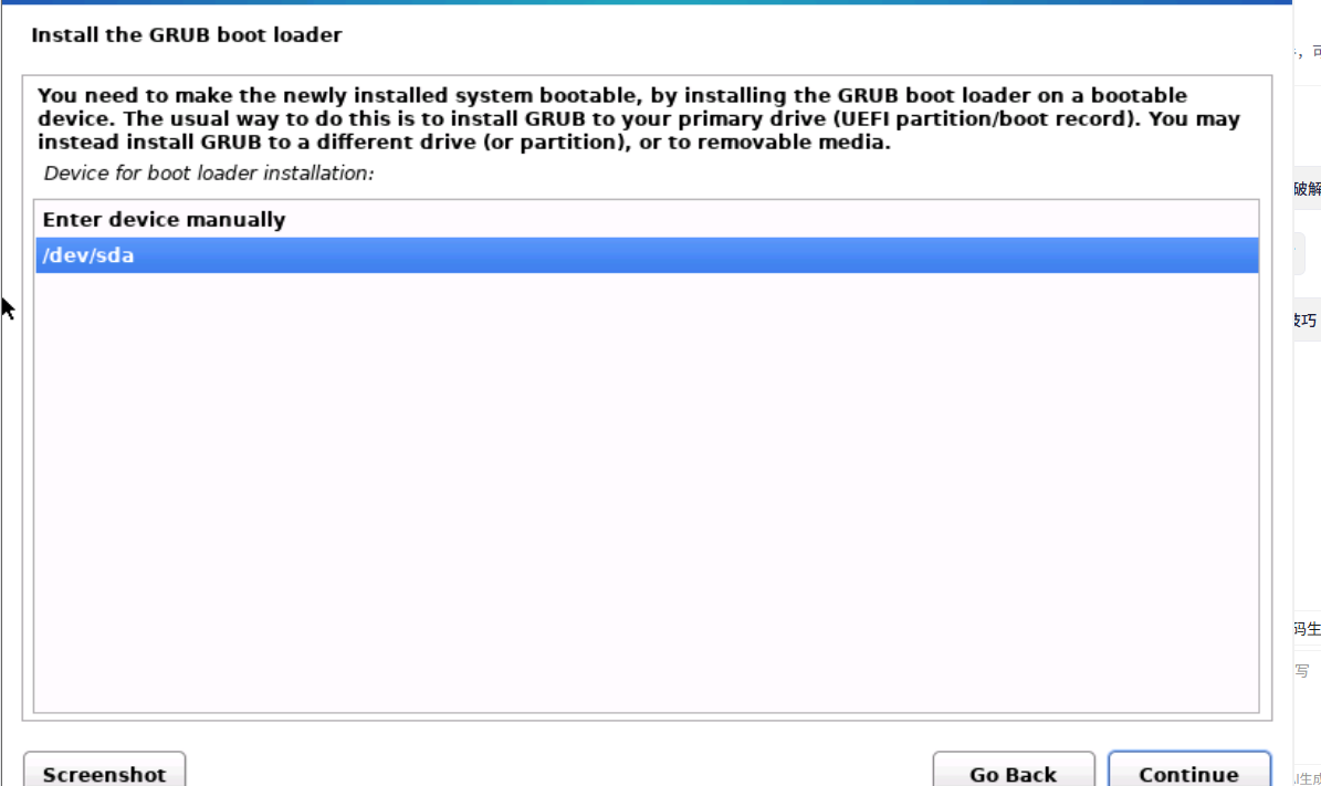 23. 安装引导分区-选择/dev/sda项,再点击下一步,继续安装