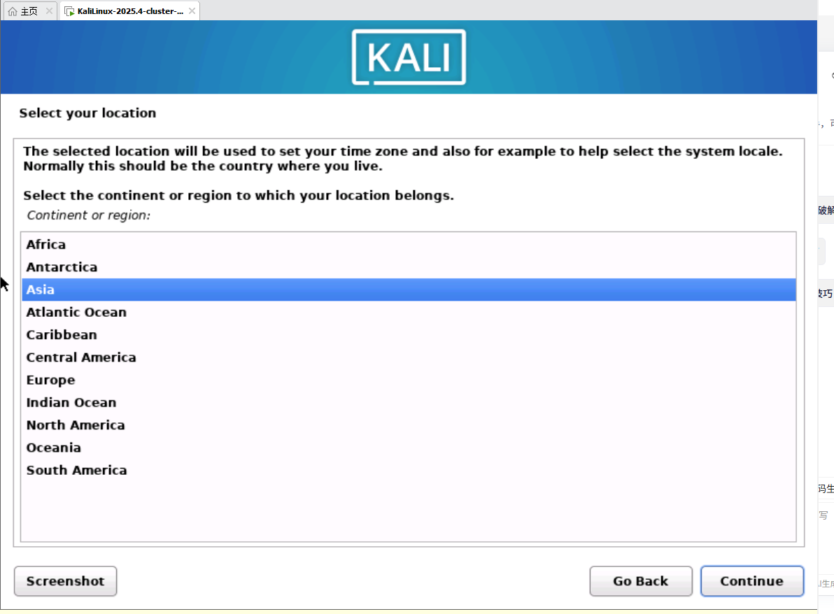 4. 选择"Aisa"亚洲区,进入下一步"continu