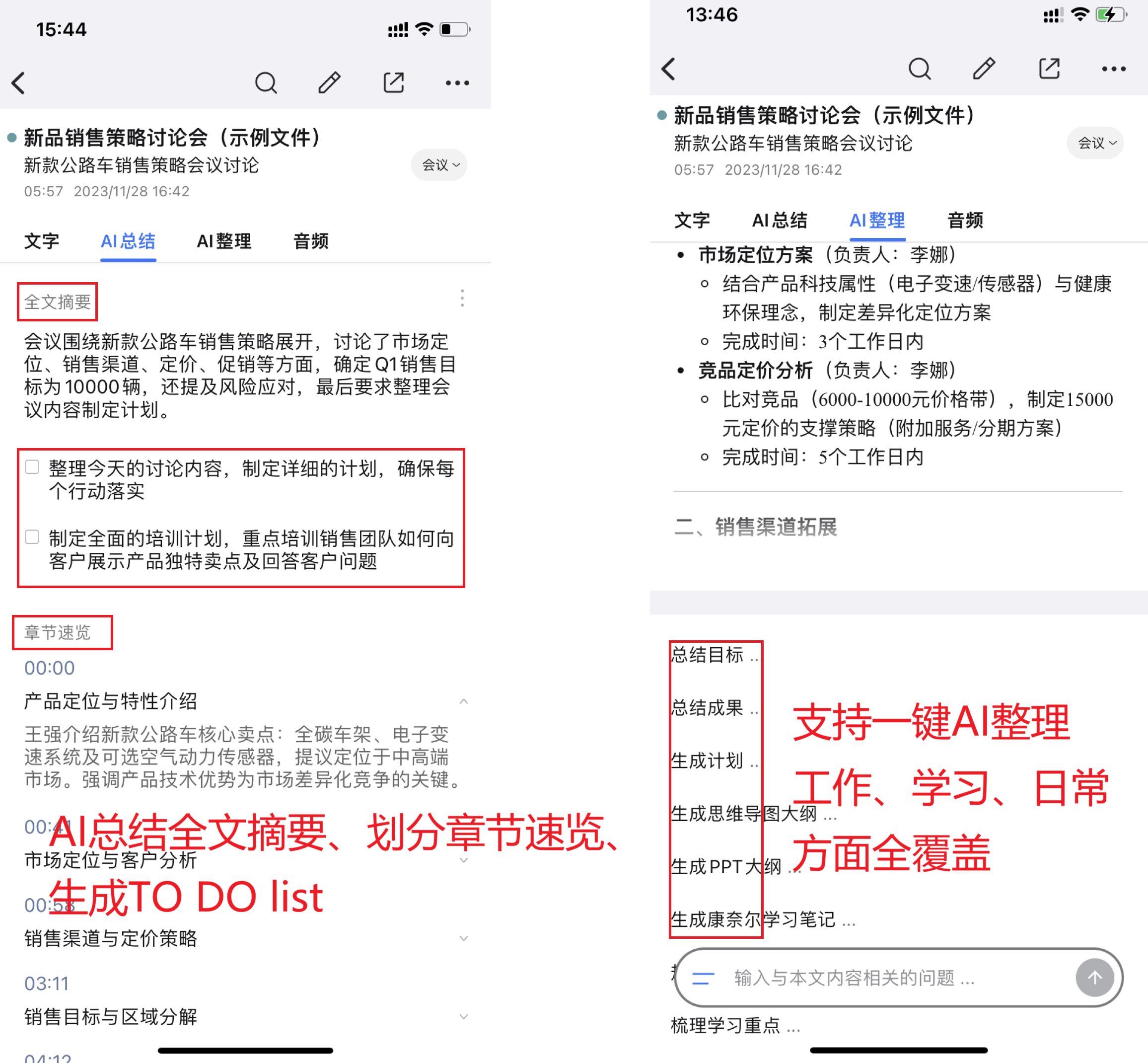 适用场景:跨部门周会、需求评审、头脑风暴、培训会议、访谈记录、课堂学习等所有需要记录和沉淀的场景。