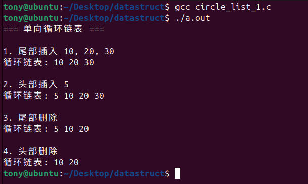 printf("=== 单向循环链表 ===\n\n");