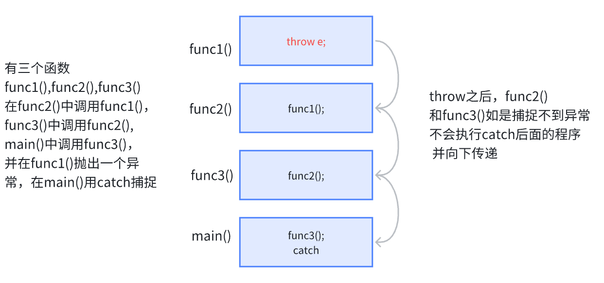 - 如果 throw 出现在某个 try 块内部,那么会优先找这个 try 块绑定的 catch 块尝试捕捉;但如果 throw 出现在 catch 块内部(或 try 块外),则会直接向上抛,不会找当前 try 的 catch