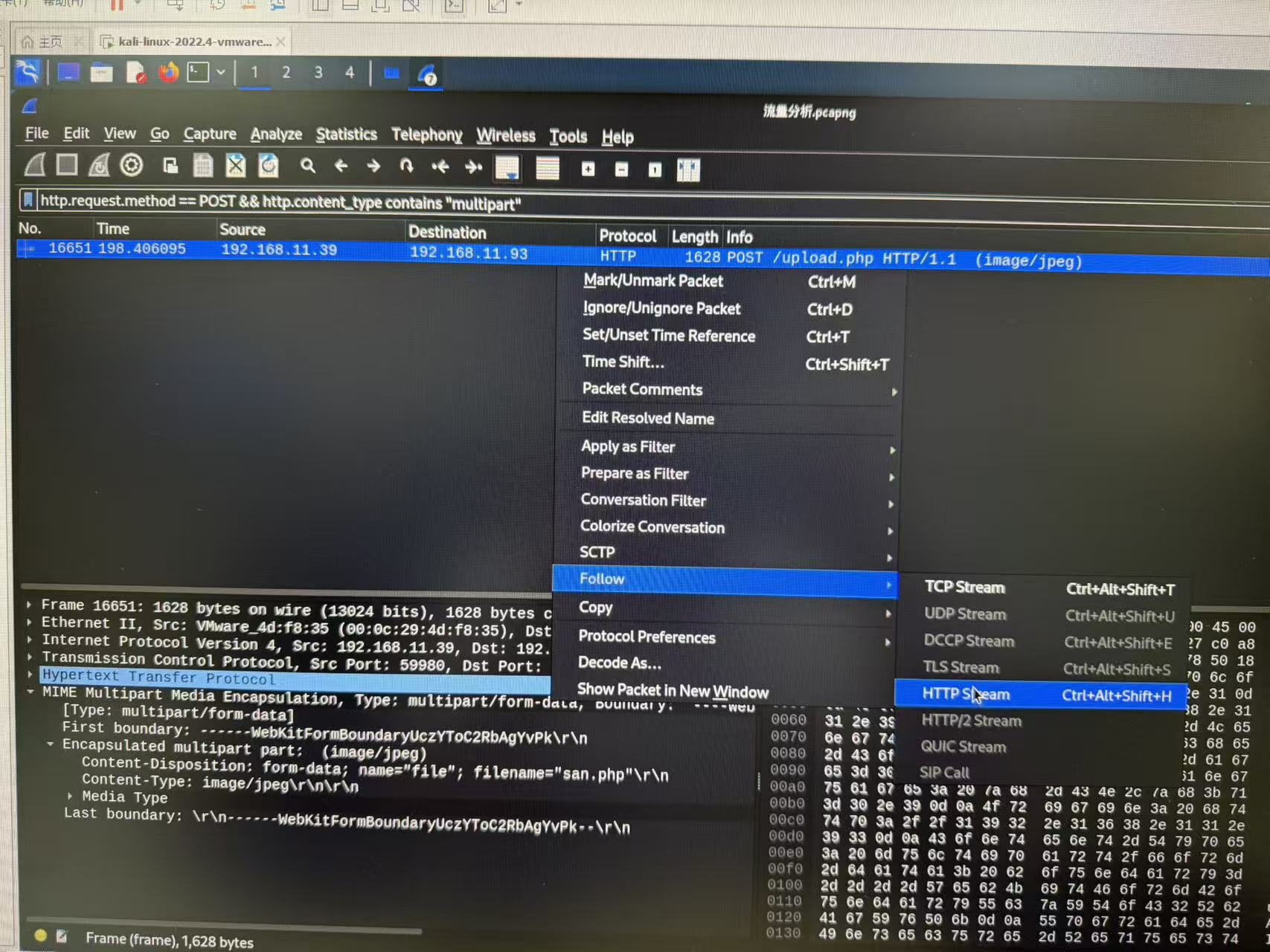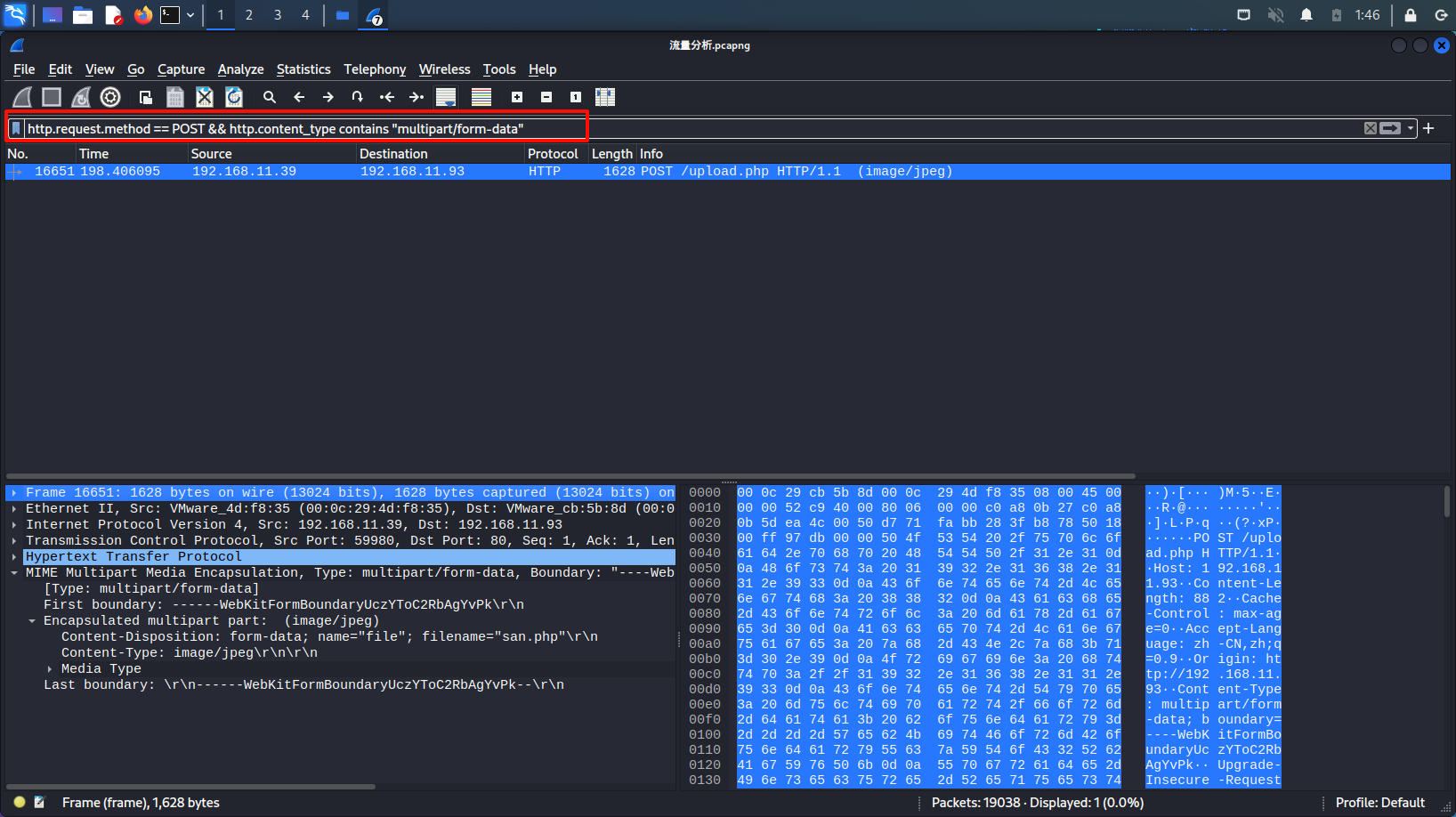 Step1。筛选数据包。在wireshark中设置filter的http.request.method为POST、content_type包含"multipart",发现只有一个数据包Frame16651。