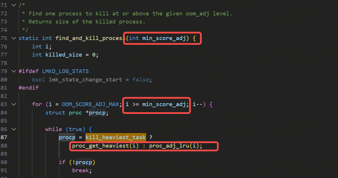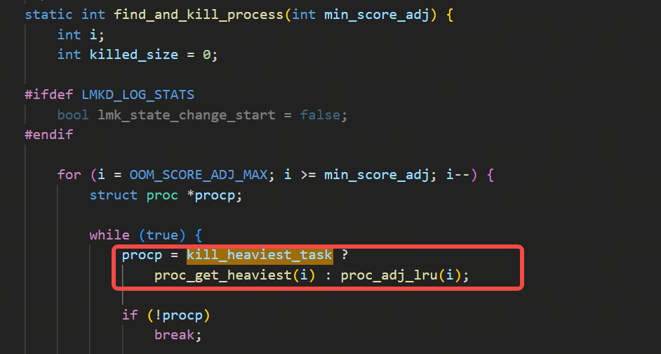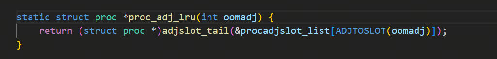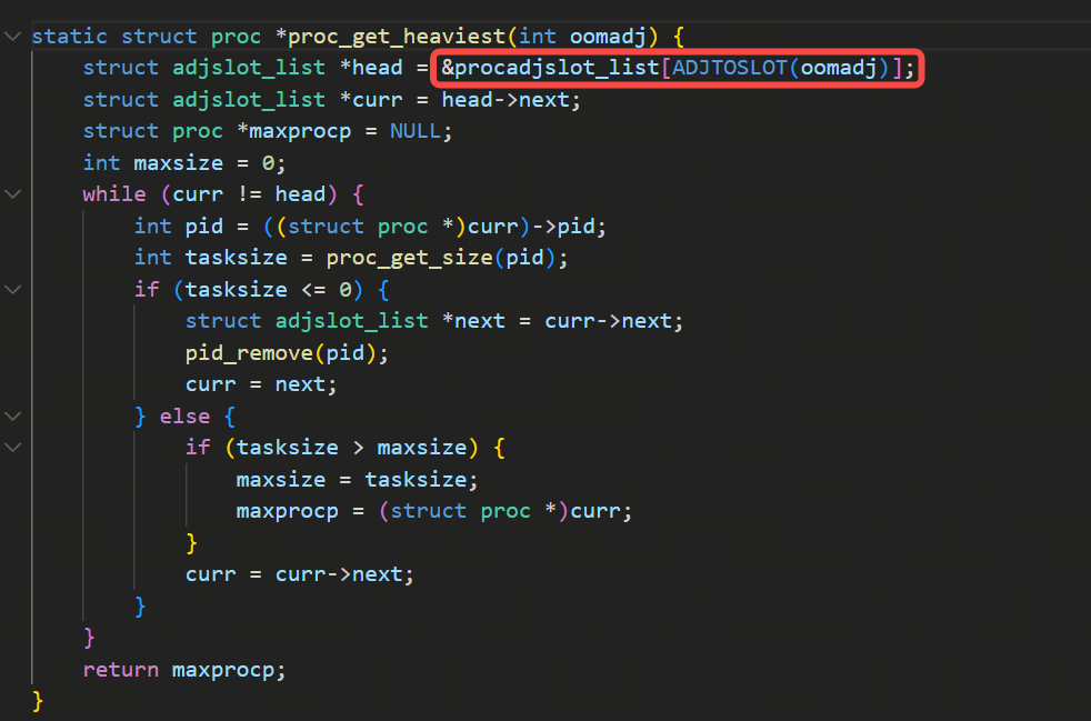 逻辑是从max的oom_score不断地减一来遍历,如果oom_score对应的槽位有任务,就返回,用的是ADJTOSLOT宏来通过oom_score找到对应的槽位,但是要根据当前的配置,配置如果是在满足大于等于oom_adj数值的任务里挑选内存使用量最大的任务,则走下图里的这个proc_get_heaviest函数: