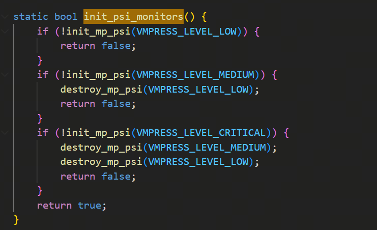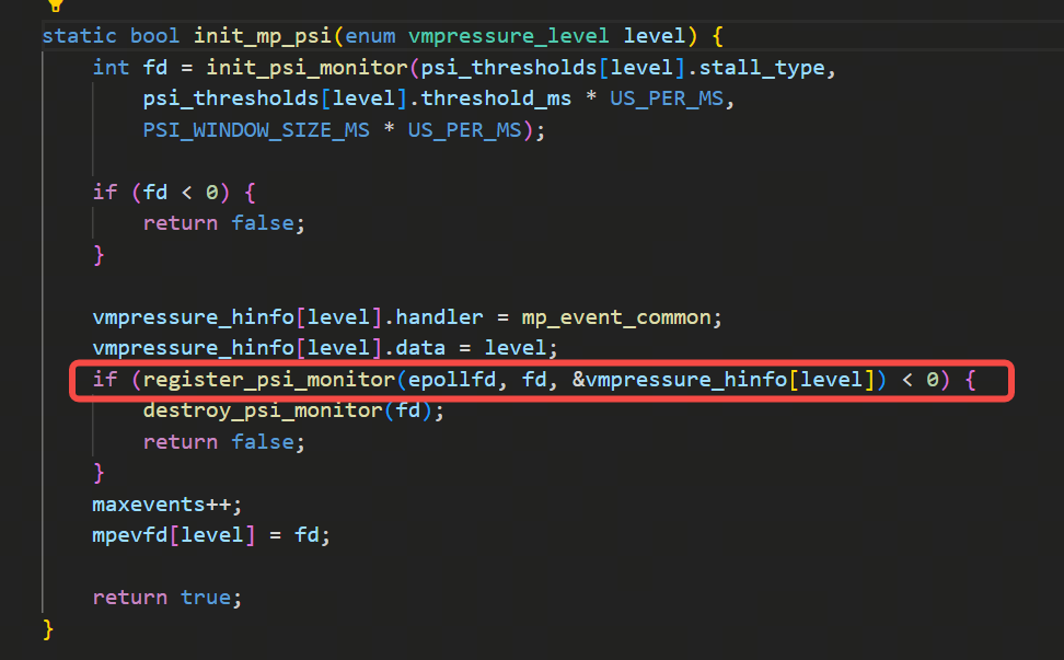 这里初始化逻辑里,除了listen的fd需要去epoll_ctl以外,还需要设置我们定义的三级psi内存水位,并进行epoll_ctl,这块逻辑在init_psi_monitors里: