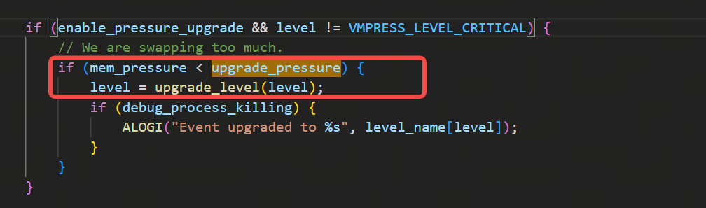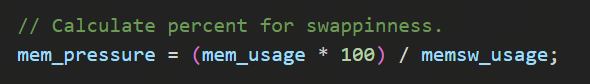 它的运算方式是(usage/usage+swap),即内存总使用量除以(内存总使用量+swap分区使用量),如下图,如果发现当前系统里的(usage/usage+swap)比属性定的阈值upgrade_pressure要小,也就说明swap的使用量比较多,那就需要升级压力等级: