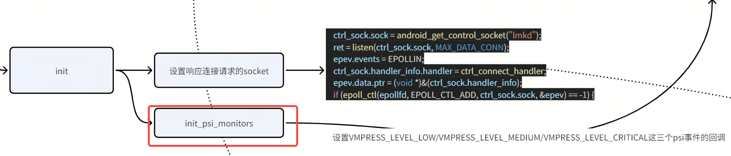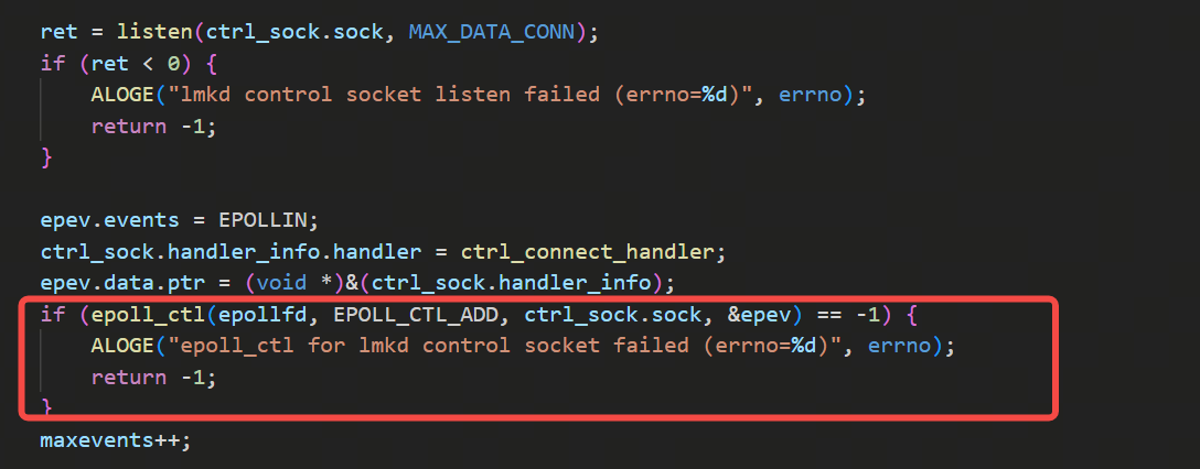 2)epoll的一些初始化逻辑,因为lmkd是一个服务端,得响应客户端发来的请求,虽然目前从代码里看,会给lmkd发请求的任务并不多,虽然不多,但是也得有这个socket交互的逻辑